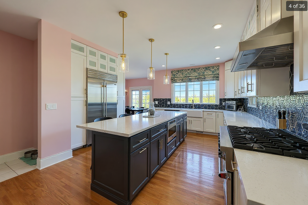 make wall and ceiling paint light flesh tone add a roman shade in the window with fabric similar to designer s guild tapestry flower platinum add lantern pendants over kitchen island match ceiling color to walls