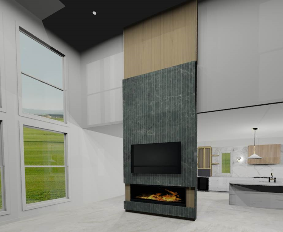a modern two storey fireplace brighten ceiling add led strip lighting between wood and green grooved material bring bright sunshine through windows show fireplace on with warm flame