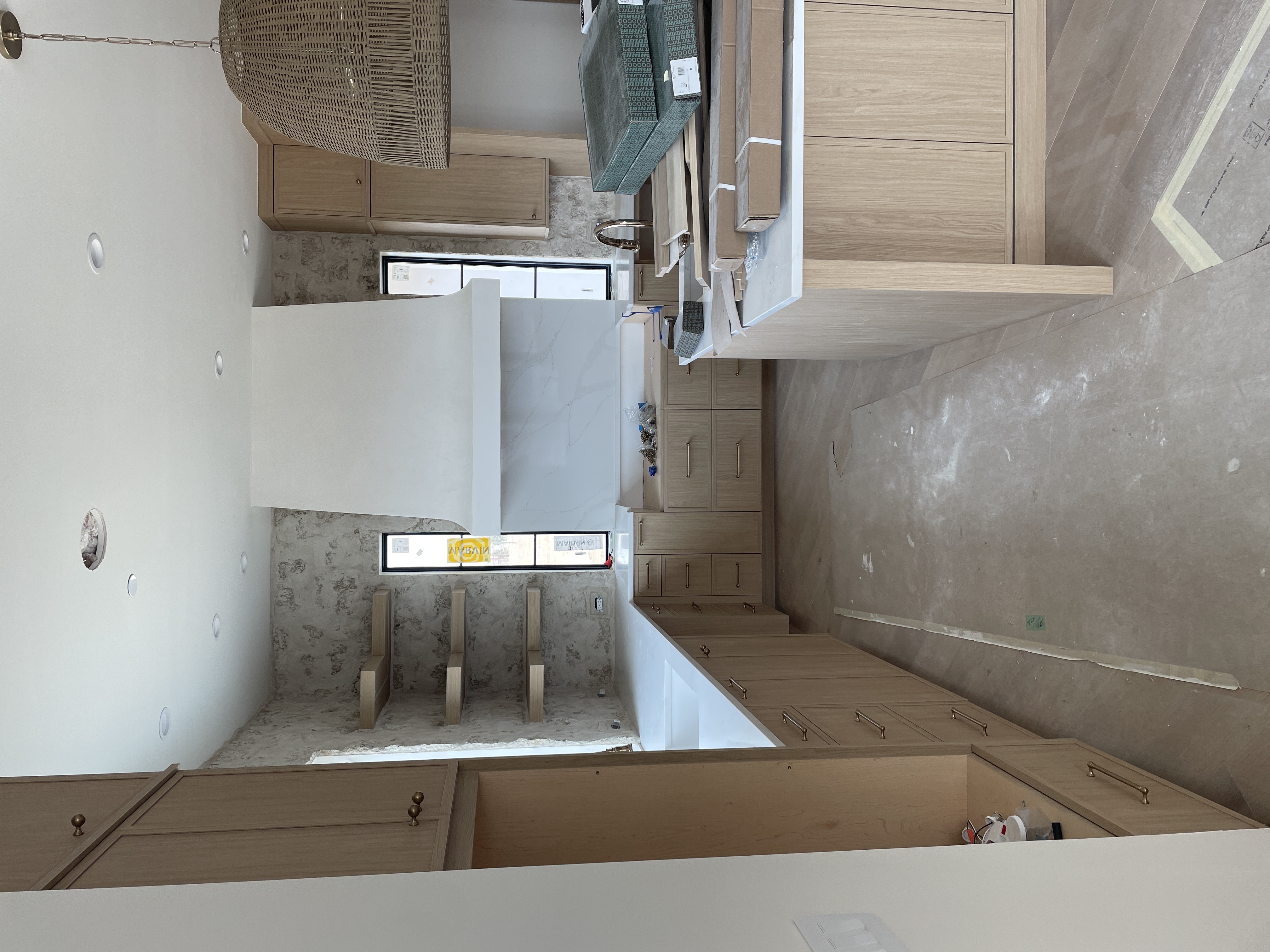 do not change the cabinets at all preserve the exact cabinet colors materials finishes door style drawer style hardware proportions reveals geometry and alignment exactly as shown do not alter the countertop flooring walls ceiling angles perspective lighting direction appliances or any architectural elements keep the camera viewpoint absolutely identical only remove clutter construction materials and unfinished areas clean the room and make it look fully finished add only minimal tasteful staging items appropriate for the space such as a small plant or a folded towel do not add any furniture or change anything about the cabinets countertop or room structure negative constraints no cabinet changes no perspective changes no angle changes no color changes no resizing no shape changes no geometry changes no filler changes no hardware changes no new cabinetry no wall changes no added shadows that distort structure add a range top below the hood put a double oven in the cabinet opening on the left add stools to the island turn the lights on stage for a kitchen