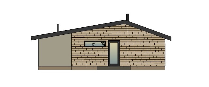 modernist exterior shot a modern single story house with a sloped roof the walls are beige wooden bricks providing a warm natural texture the roof is a sleek dark gray contrasting with the lighter walls large windows feature on the fa ade set in black frames allowing natural light to flood in the atmosphere is cozy yet contemporary with a serene and welcoming environment use a soft ambient light to enhance the earth tones of the bricks and the clean lines of the architecture the setting is lush with greenery suggesting a peaceful suburban or rural setting architecture