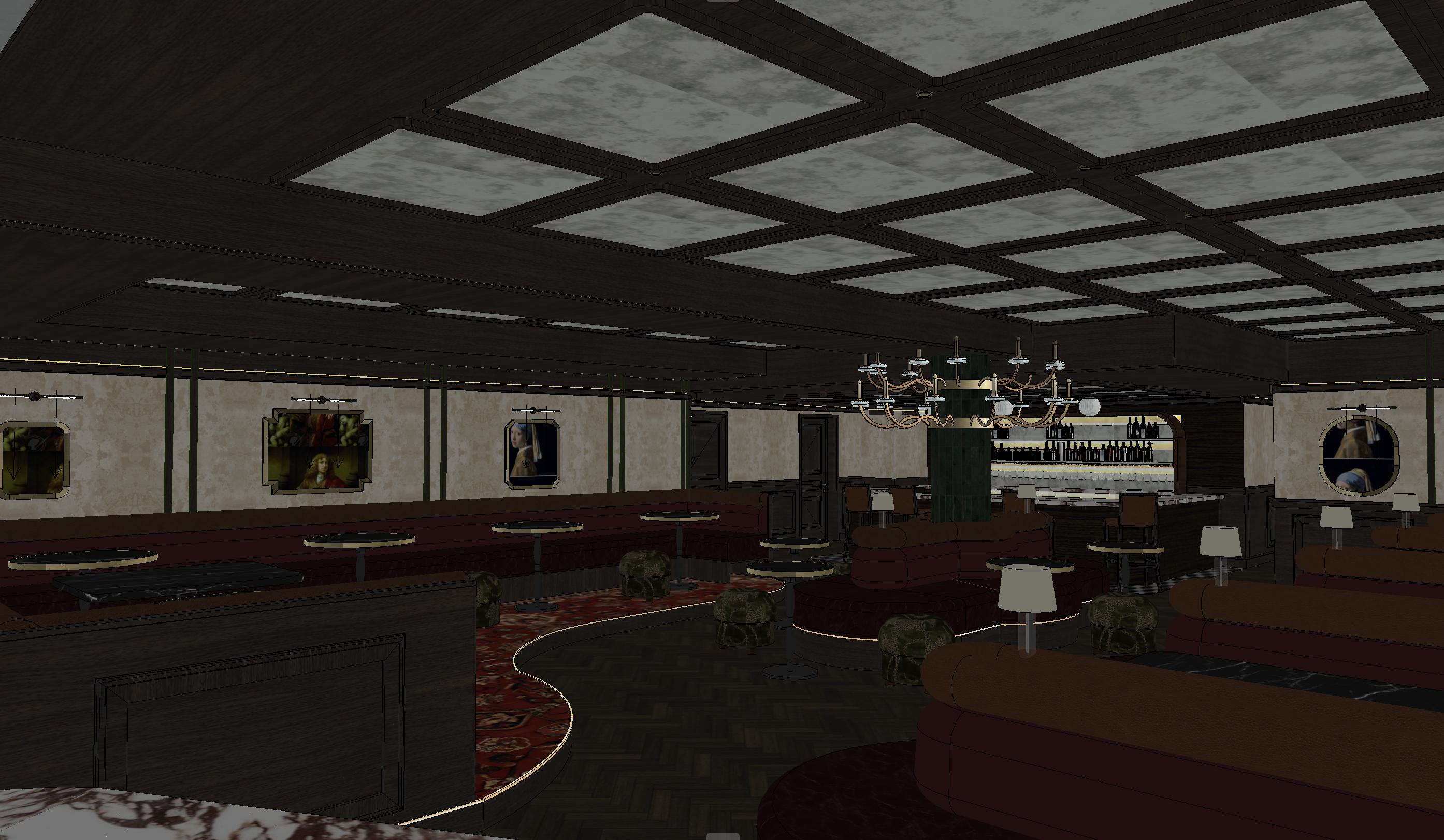 a bright ultra realistic interior render of a vintage new york restaurant keeping the exact camera angle and geometry dark oak coffered ceiling with antiqued mirror insets now equipped with small recessed spotlights that add focused warm illumination throughout the room along every wall mounted painting dedicated picture lights highlight antique artworks in heavy carved gold frames walls finished in aged italian plaster with vintage patina led lighting 2700k runs continuously along the step edges under each banquette base and around the full perimeter of the room creating a soft golden glow that shapes the interior architecture and adds depth burgundy faux leather banquettes with warm brown leather backs positioned on curved platforms velvet ottomans in panther pattern upholstery tables made of black calacatta marble with polished brass edging the bar area features a viola calacatta marble countertop bar shelves are softly backlit illuminating rows of bottles with warm amber reflections dark oak herringbone parquet flooring grounds the space central column clad in deep green glossy tile surrounded by a sculptural gold chandelier with crystal accents all lighting led lines ceiling spots picture lights chandelier glow bar back illumination works together to create a bright rich and atmospheric high end hospitality rendering ultra realistic materials clean reflections dramatic yet controlled lighting maintaining the dark vintage character while presenting the scene clearly and elegantly