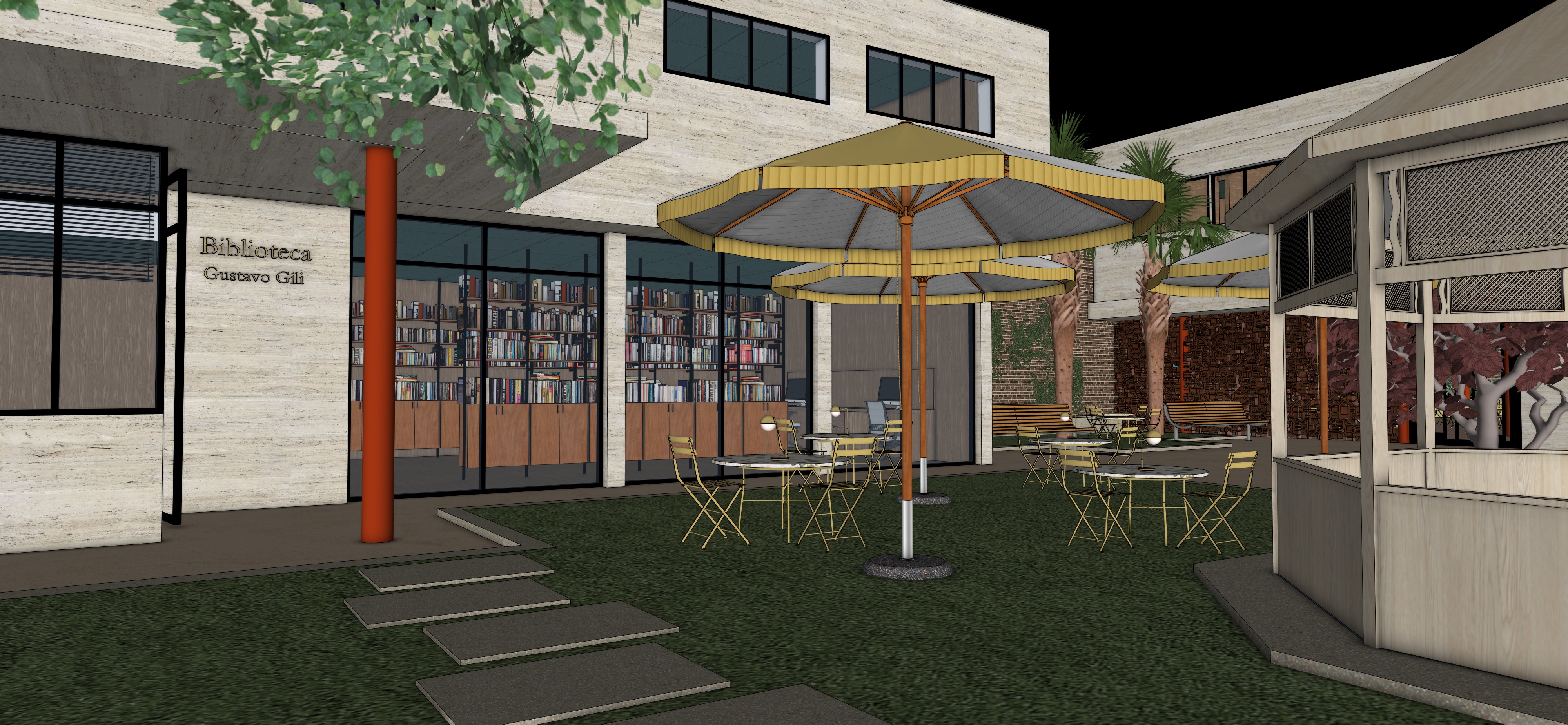 use the uploaded sketchup model as the absolute reference strict preservation mode do not modify the architecture do not change geometry proportions layout or camera position do not redesign the building pavilion or courtyard do not move or redesign furniture umbrellas trees or the kiosk structure do not change materials colors or textures keep the fa ade windows columns and library interior exactly as modeled preserve the sign biblioteca gustavo gili exactly as it appears the image must look like the same architectural model only rendered realistically atmosphere concept community library courtyard create a warm welcoming courtyard atmosphere around the library the space should feel like a calm cultural meeting place where people gather to read study and share time together people and community life add natural community activity appropriate for a library courtyard small groups of people sitting at the caf tables reading books a few people studying or working quietly with laptops someone reading alone under the umbrellas two or three people having a quiet conversation about books a person walking slowly through the courtyard with a book a couple of people browsing books visible through the windows inside the library expressions should feel relaxed thoughtful and happy the mood should communicate community learning calm interaction and shared culture lighting soft natural daylight warm mediterranean courtyard light gentle sunlight filtered through tree leaves soft natural shadows realism rule enhance the scene only by adding people atmosphere and realistic lighting do not redesign architecture furniture materials or signage the final image must look like the exact same architectural project only alive with community activity do not change the colours of the umbrellas do not change the colors or materials of the chairs and tables do not change the architecture