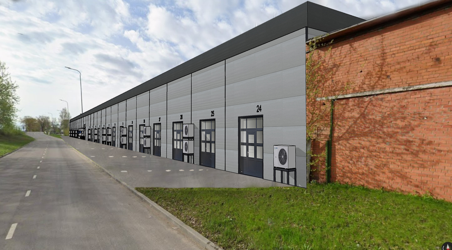 on the site in front of the garage doors minivans and passenger cars are parked perpendicular to the building