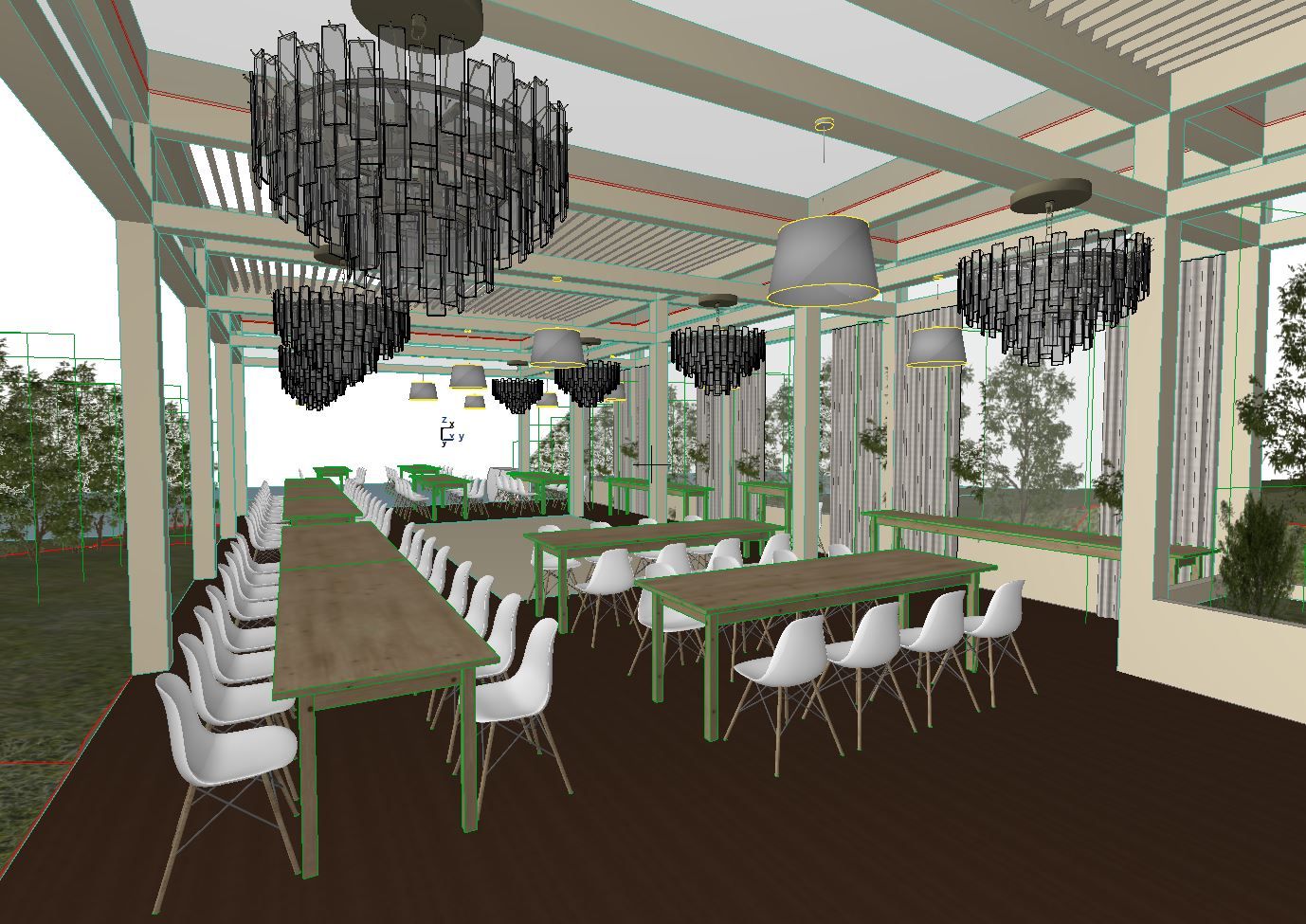 a modern restaurant terrace with a pergola for events modern design of chairs and tables that are set up for a elegant events elegand floral arrangements creating an atmosphere that is both sophisticated and romantic the tables were set for guests at round shaped tables complete with gold candlesticks white plates silverware pink and cream colored tablecloths exquisite centerpieces and delicate accents like vintage crystal chandeliers hanging from above in one corner on the right there are glass walls with neutral tones luxury draped fabric hanging chandelier from the beams with crystal pieces light up the room with warm light and soft shadows from beams there are also smaller chandeliers hanging from the beams with beige fabric that light up the room with warm light and soft shadows from large windows on right hand sides of room green plants behind glass walls the floor is natural dark hardwood the pergola pillars and beams are light beige ral 1014 color code the pergola slats are also light beige ral 1014 color code pergola slats have led bands the terrain and the ground around is a lake area with greenery and grass specific for this kind of area there is a lake in the background on the farleft with a pontoon the sky is blue with a few white clouds the sunlight is warm and casts soft shadows there are decorative elements all around and green plants to make it look more realistic format picture 16 9 extradetailed and ultrarealistic interior all elements have sharp details add realistic imperfections subtle fabric wrinkles slight surface reflections natural daylight with soft shadows