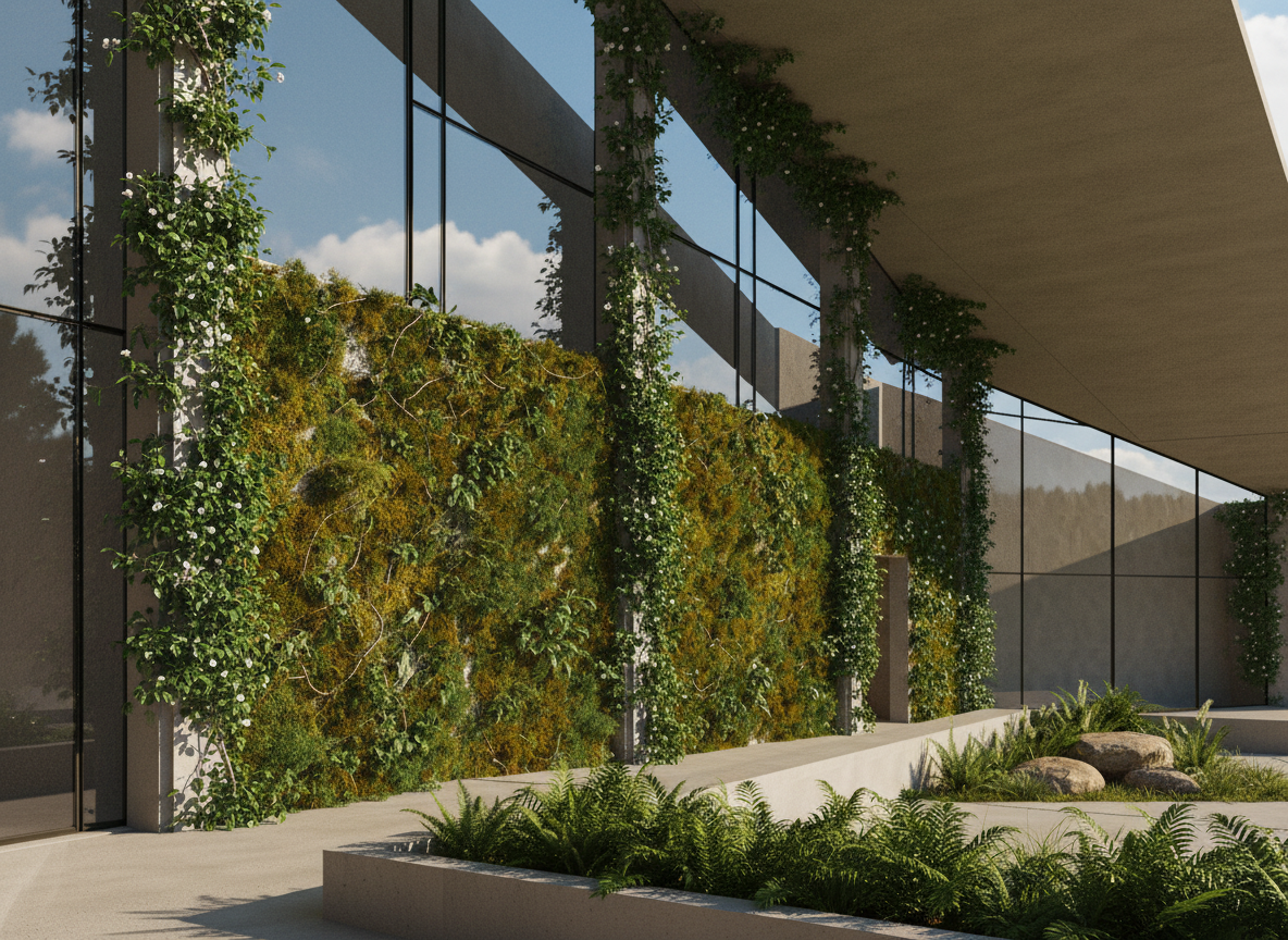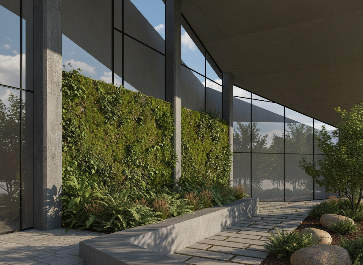 follow the drawing exactly a beautifully rendered architectural elevation of a contemporary building with moss covered concrete walls blending into its natural surroundings