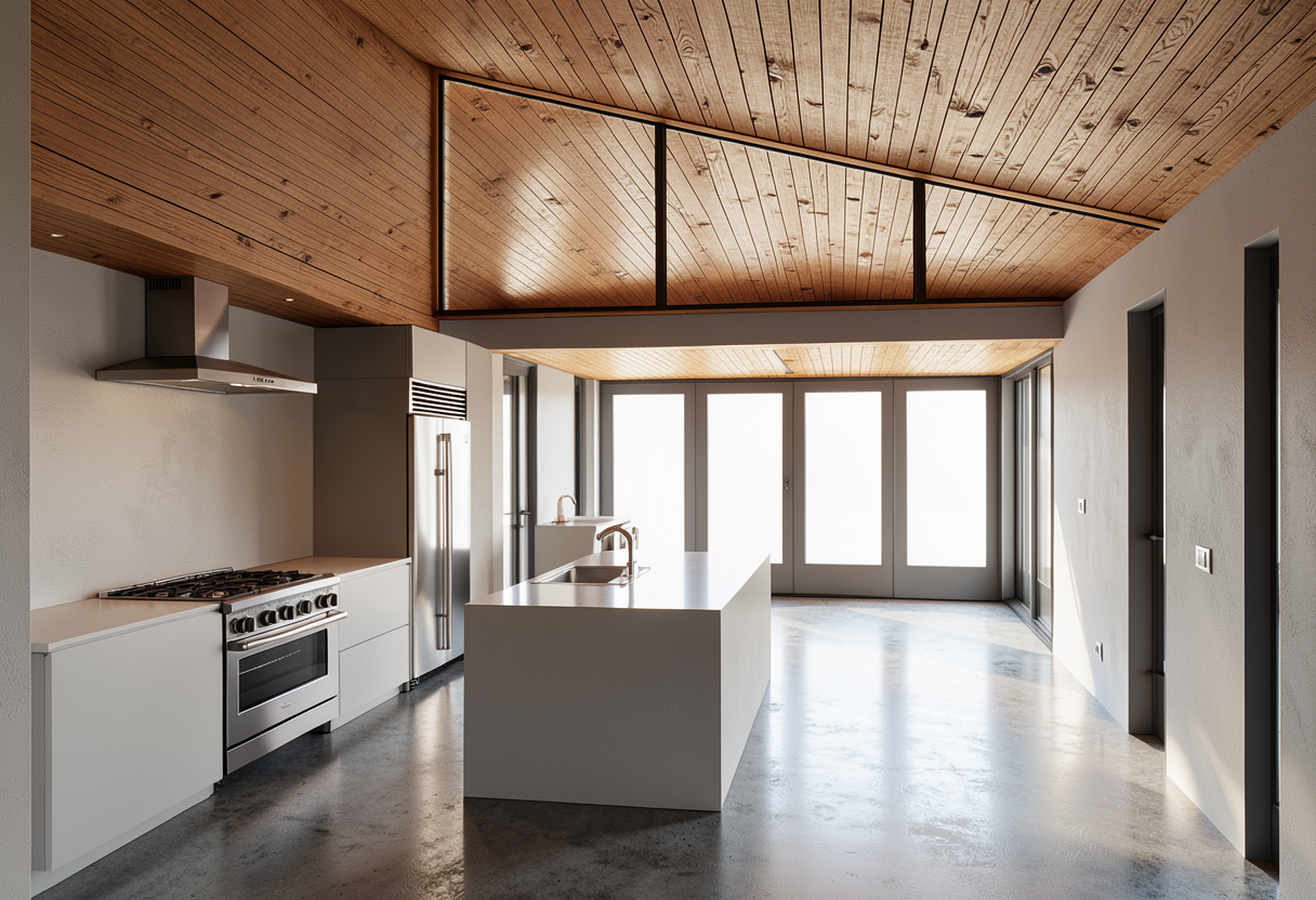 exterior shot digitally rendered architectural illustration presentation drawing extremely restrained and delicate whites soft grays near monochromatic with green as the only real accent characteristic of scandinavian or german architectural practice prioritizes legibility and elegance over realism