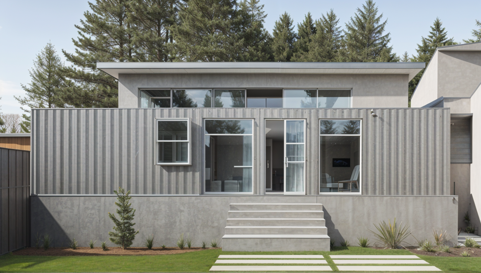 modern exterior shot black vinyl panels on front of building with horizontal black siding on the side and medium wood tone siding at the walkway to front door architecture