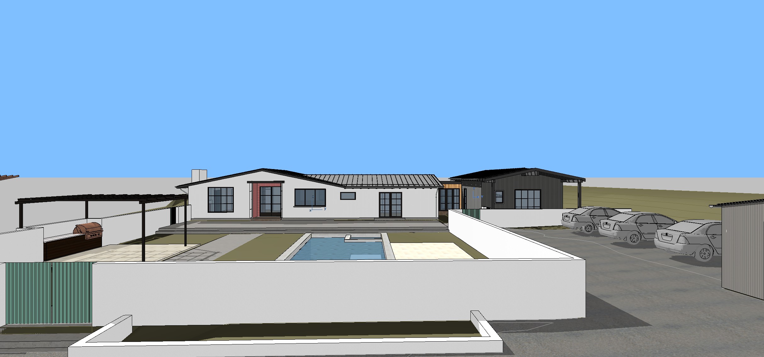 modernist exterior shot smooth white plaster walls dark bronze standing seam metal roof dark navy grey board and batten siding gravel driveway landscaping consistent with native california plantings in ojai california bronze framed door and windows oak trees surrounding background architecture