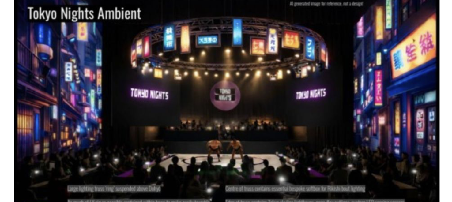 exterior shot moody dark sumo show with a lof of lights on the sides make it cinematic and realistic