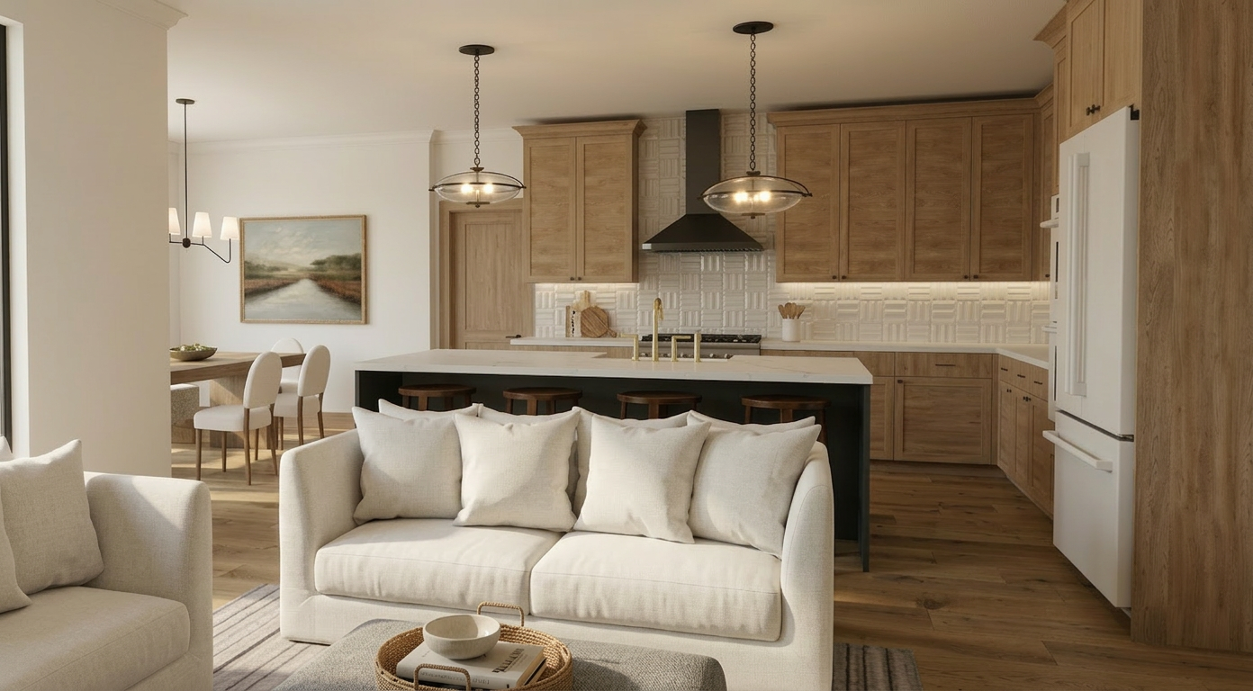 top down orthographic architectural render from the provided floor plan camera perfectly perpendicular to the floor parallel projection no perspective and no tilt preserve exact wall door and window positions do not change the layout photorealistic materials magazine quality interior design soft neutral daylight subtle ambient occlusion crisp edges use one continuous uniform flooring material throughout the entire floor plan the flooring should be a smooth matte beige surface with a very subtle texture consistent across all rooms all spaces must use the same flooring color and material do not change flooring between rooms