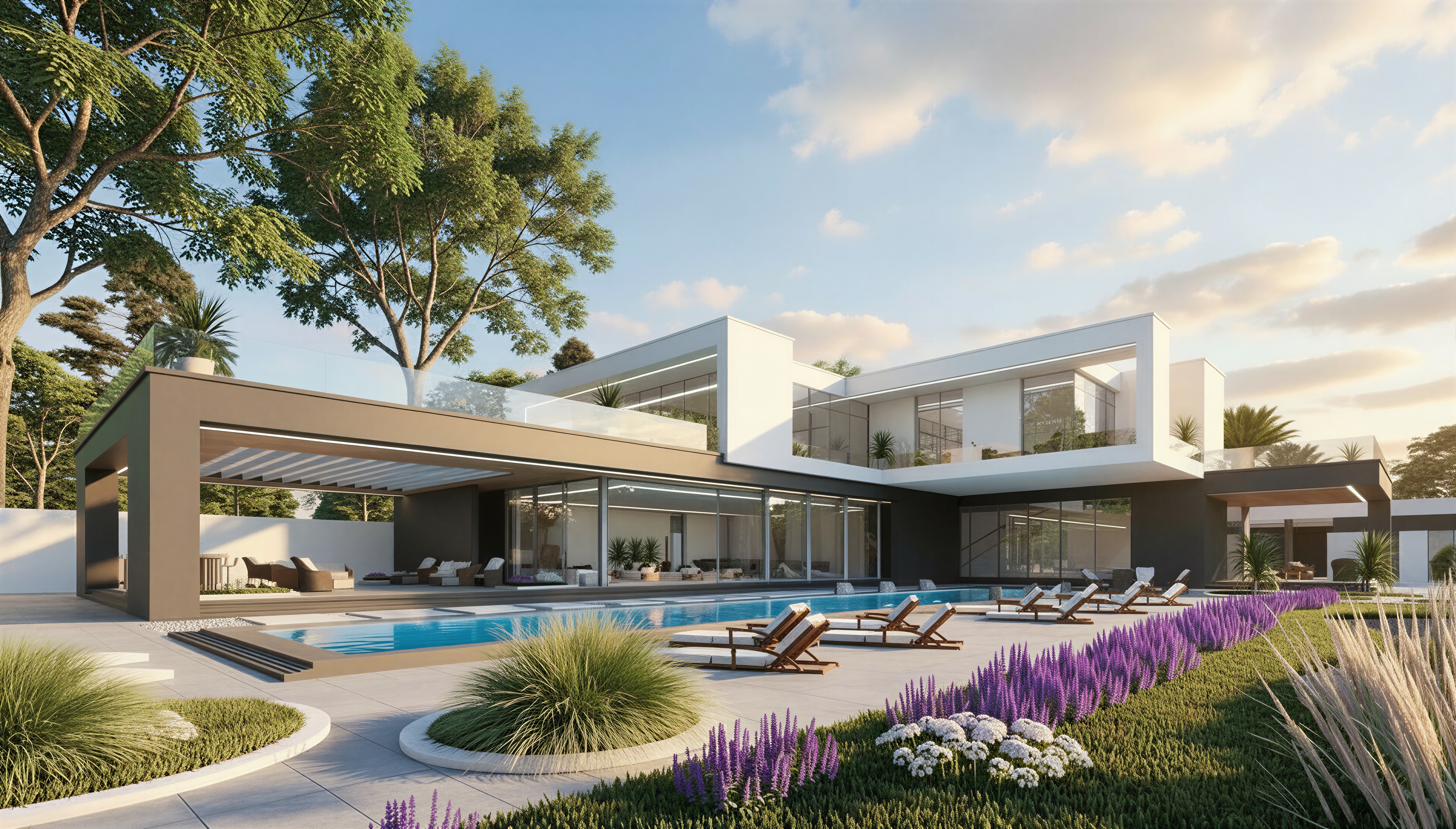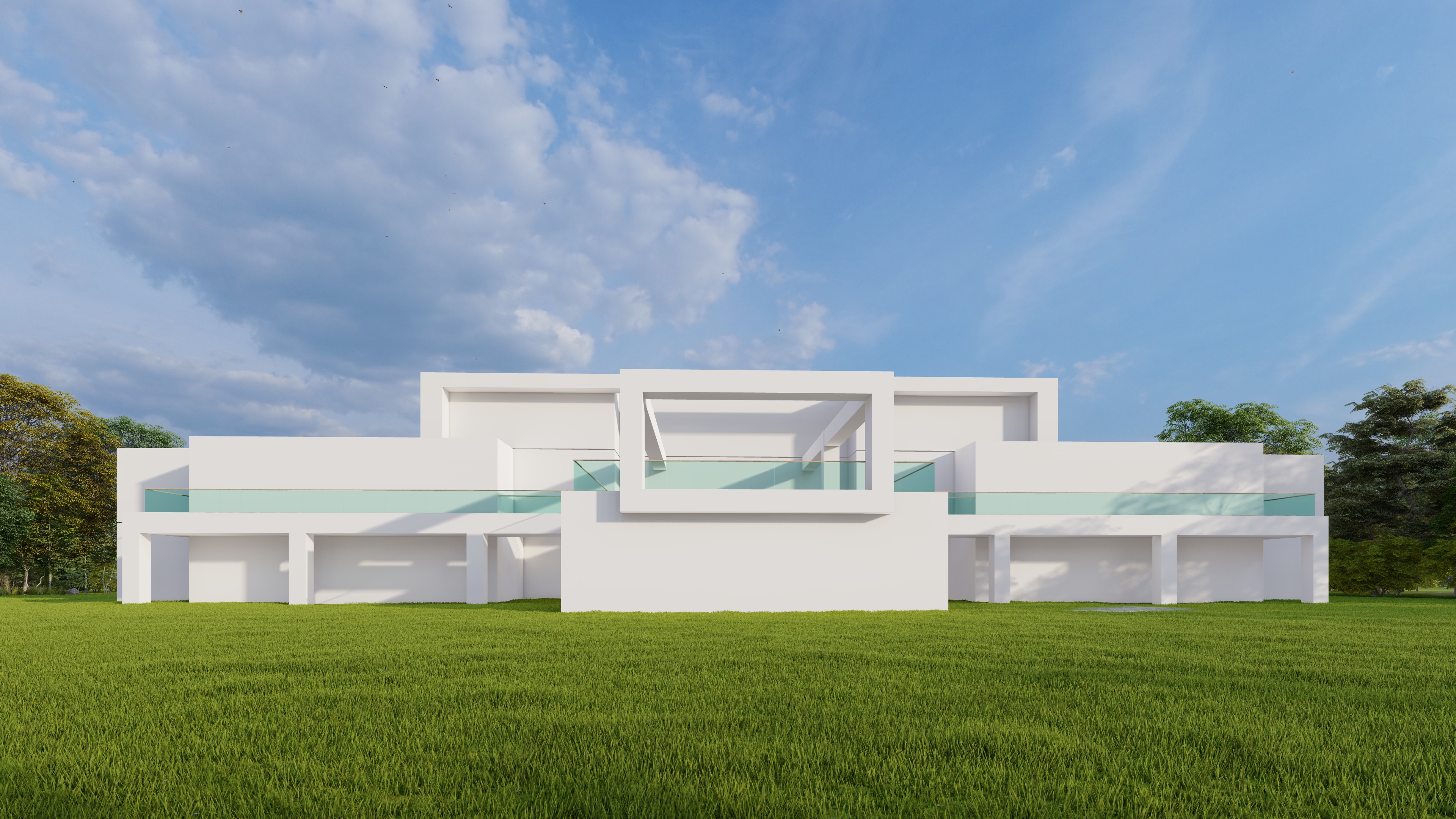 exterior shot add real effect to make it look like real photo real color real glass reflections contrast real trees reduce sun effect make look like a day view render real grass with white flowers