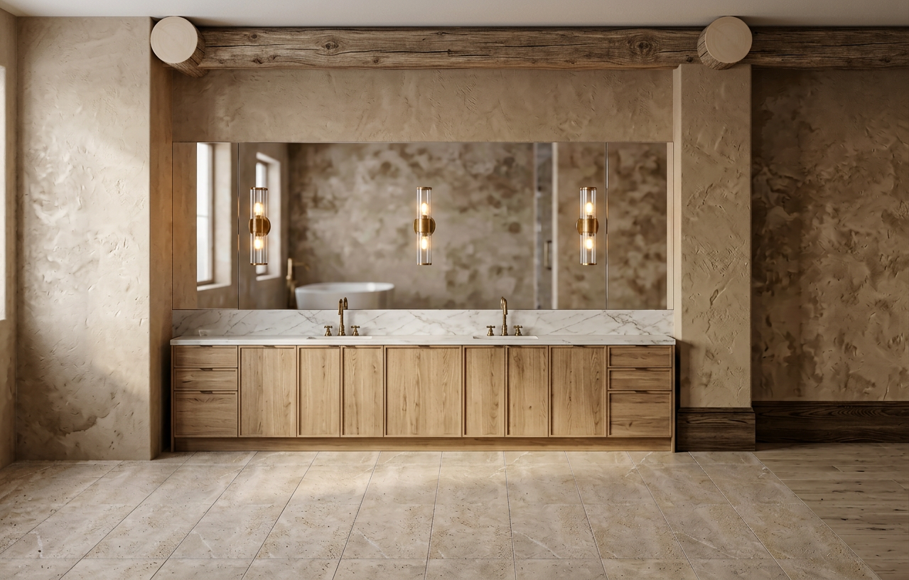 semi realistic render showing dusk lighting with some soft lights dwelling to be be finished in white render with dark vertical timber infill panels to conceal garage doors and over windows please avoid showing neighbouring properties show minimal landscaping and light coloured exposed aggregate driveway please show neighbours as two storey built form with no windows just greyed out massing driveway to only be width of garage