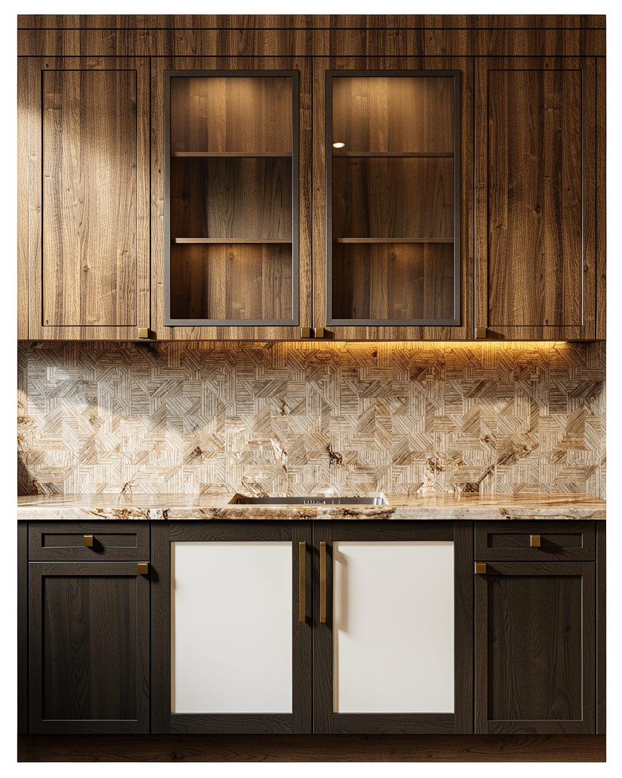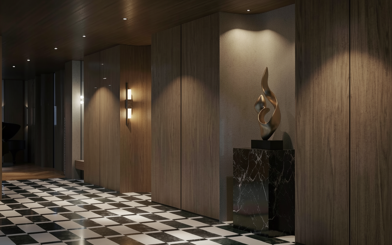 improve materials texture make it realistic keep colors tones and patterns the same make the image photorealistic high resolution keep all elements and colors the same keep image environment at night time don t make environment too dark keep same lighting keep same camera distance avoid zoom in keep same camera angle calm ambient luxury feel maintain same wooden color as reference image no glare around wall lights keep same flooring colors maintain curves on the walls same as reference image
