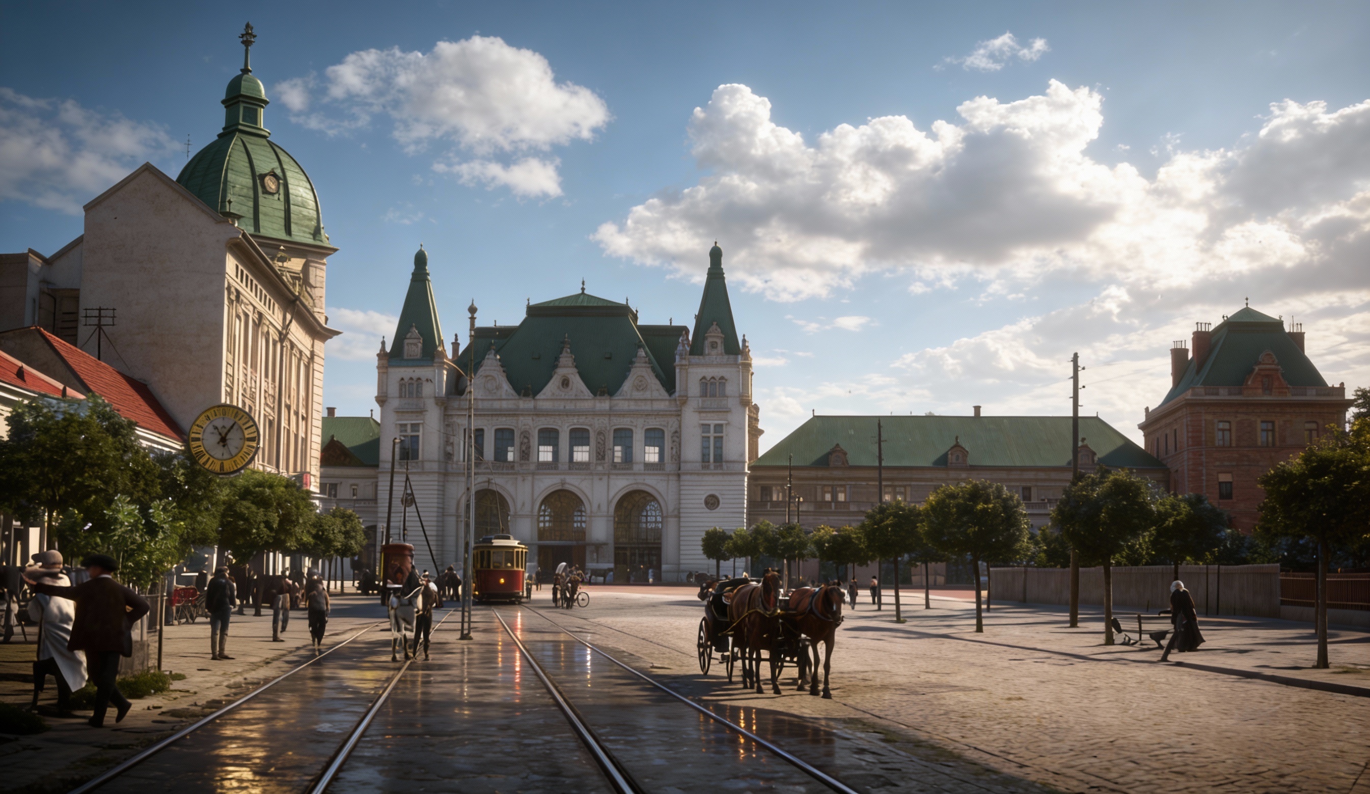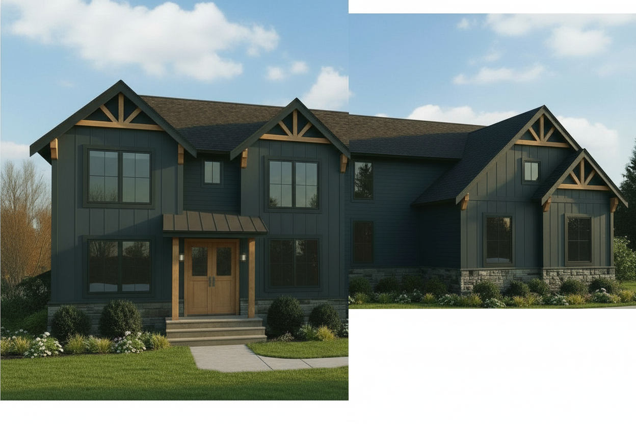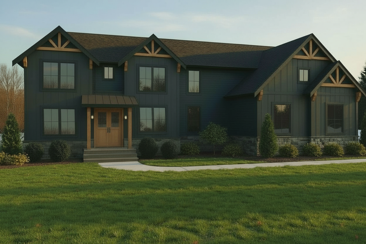 real world architectural photograph of a newly constructed detached garage in a rural residential orchard setting the garage is placed along a dirt access road bordered by green orchard trees and maintained grass areas with a soft lush agricultural landscape and healthy foliage single story garage with shallow gable roof clad in traditional clay terracotta roof tiles curved profile tiles warm earth tone color clean and uniform not wood shingles or slat roofing exterior finished in clean off white stucco with subtle natural texture and softened edges brick wainscot base in clean new condition with crisp mortar joints three custom horizontal plank wood garage doors with natural wood grain matte finish precise alignment solid wood pedestrian door and simple window light gray concrete apron transitioning into a dirt driveway shot at eye level with a 35mm lens soft morning or late afternoon daylight gentle shadows even illumination neutral exposure calm sky gradient lighting is natural and diffused not harsh or dramatic looks like a real photograph of a newly completed garage on a green rural property