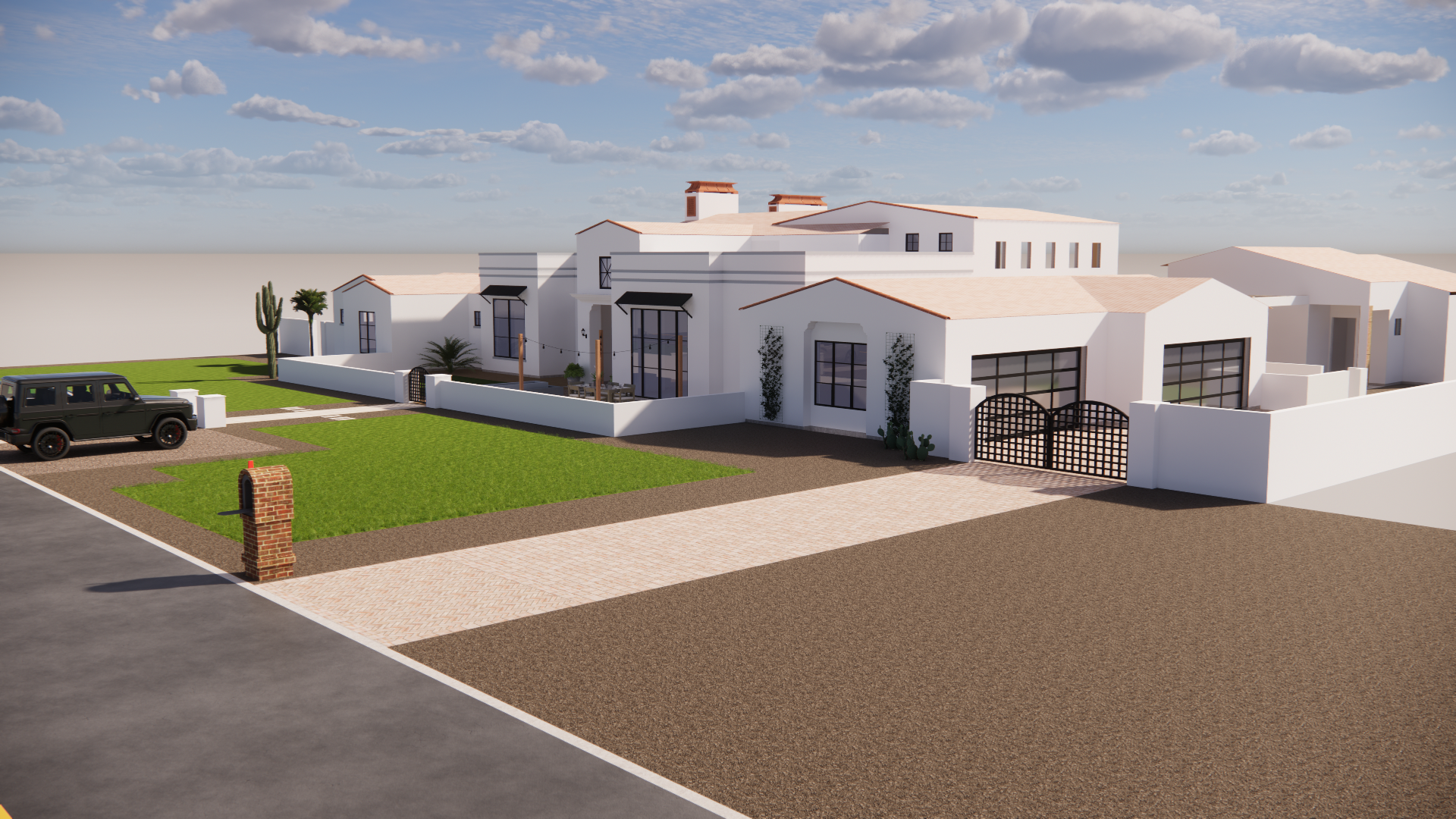 this home is in phoenix arizona render as a photo quality image with clear skies at 10 am add some vegetation around the green lawn in the gravel perimeter