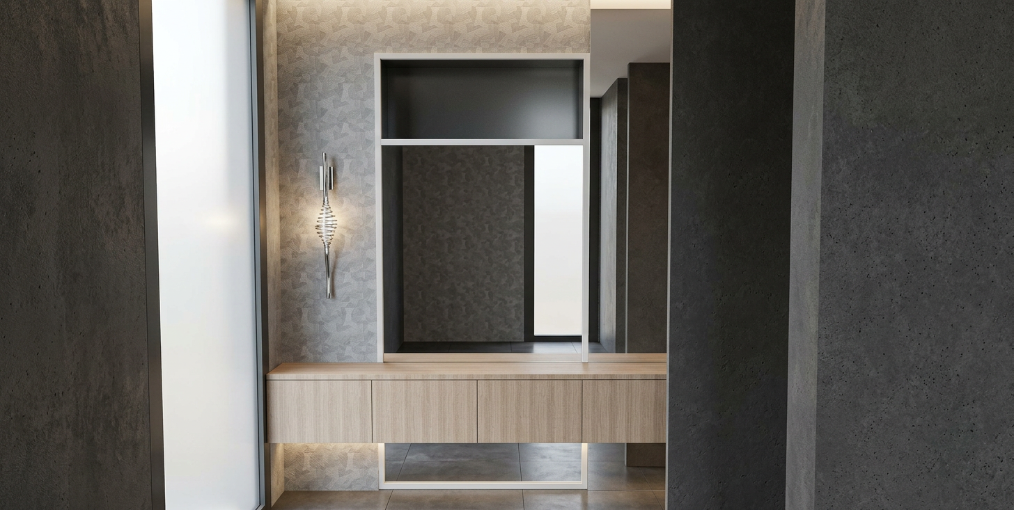render an elegant modern interior entry featuring a light gray geometric patterned wall incorporate a sleek metal sconce in a polished silver finish the centerpiece is a floating console with a dark grey wood texture against a background with a large reflective mirror the floor showcases a concrete tile contributing to the sophisticated ambiance use a soft ambient lighting to enhance the contemporary and minimalist atmosphere left is white wall center is window with black frame that looks on a covered patio with feature wall