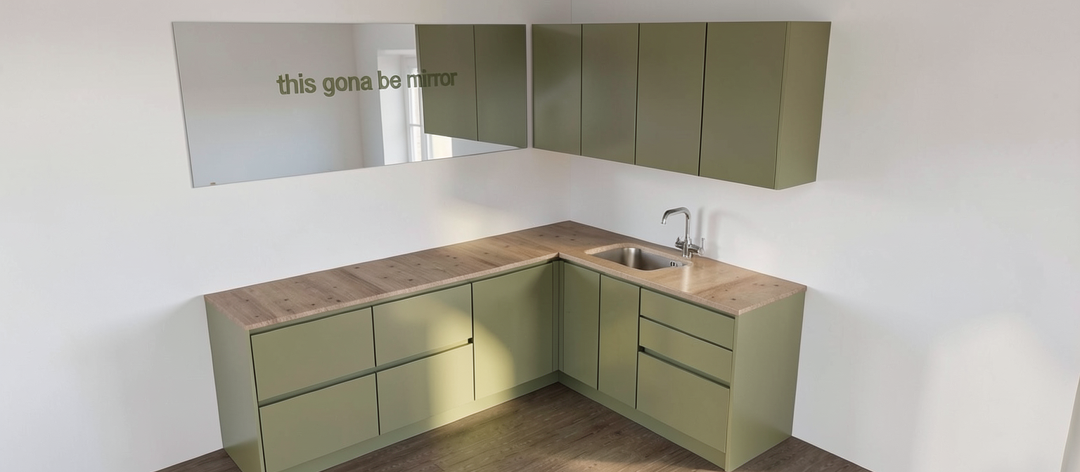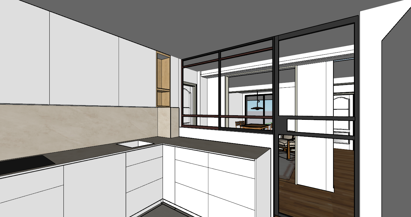 this is a kitchen behind this first view a blind door can be seen a living room with a window at the back and to the right of the image a hallway and another blind door at the back