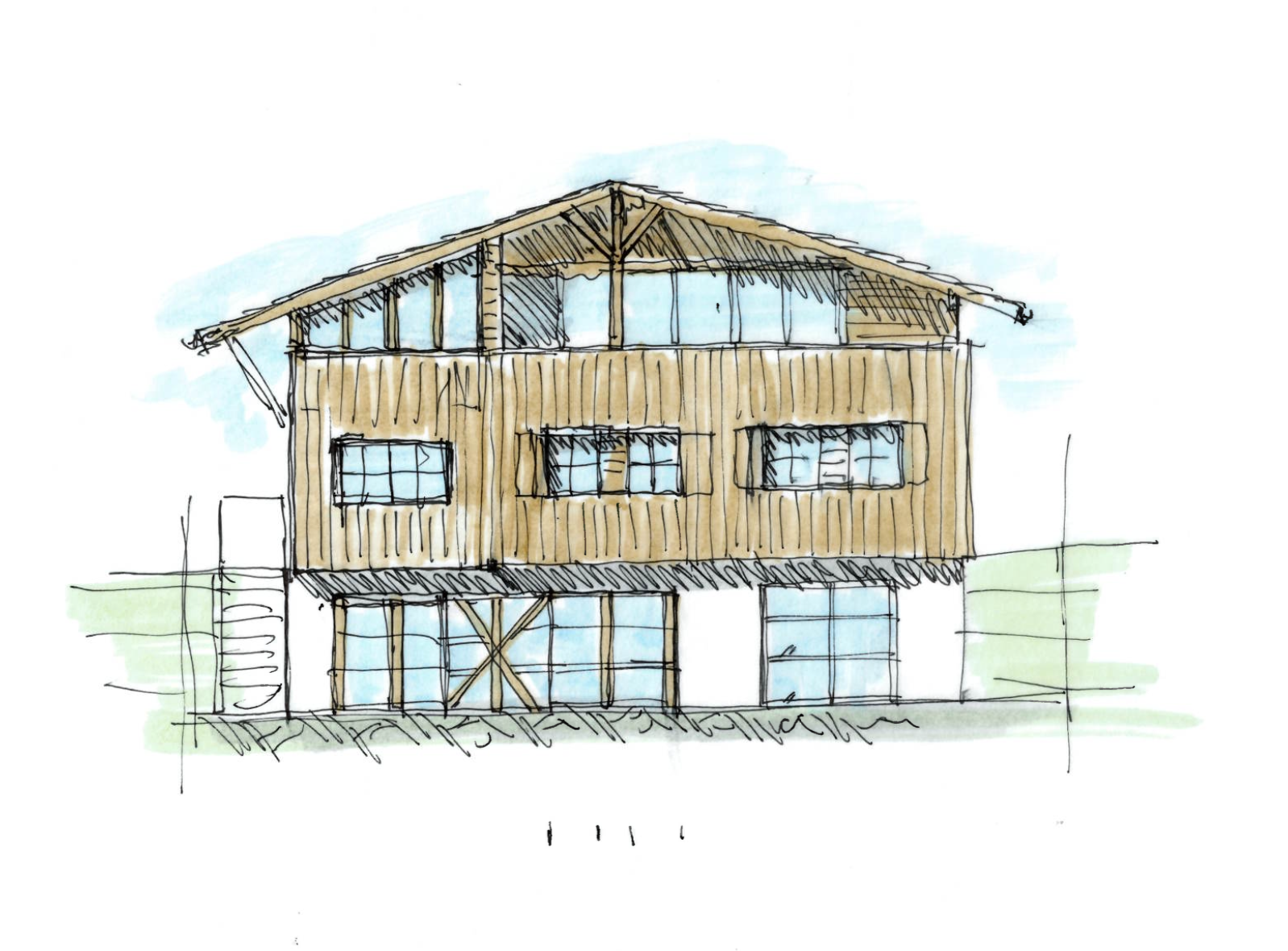 photorealistic architectural visualization of a traditional alpine chalet set on a lush green hillside the building features a large pitched roof with deep overhangs and exposed timber beams the upper level is clad in weathered vertical wooden planks with a rustic texture while the ground floor has light plaster walls and large glass doors opening to a wooden terrace the chalet has a wide balcony across the front with natural timber railings and large windows beneath the roofline surrounding the house are rolling grassy slopes alpine vegetation and dense pine forest in the background the environment feels peaceful and rural with soft late afternoon sunlight casting warm tones on the wood facade realistic shadows detailed wood grain and natural materials enhance authenticity include subtle landscaping such as bushes wild grass and small garden elements around the terrace