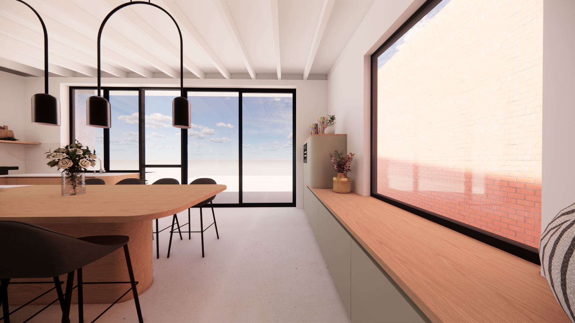 add realism and warm effect back ground exterior with a swimming pool on the long side and vegetations