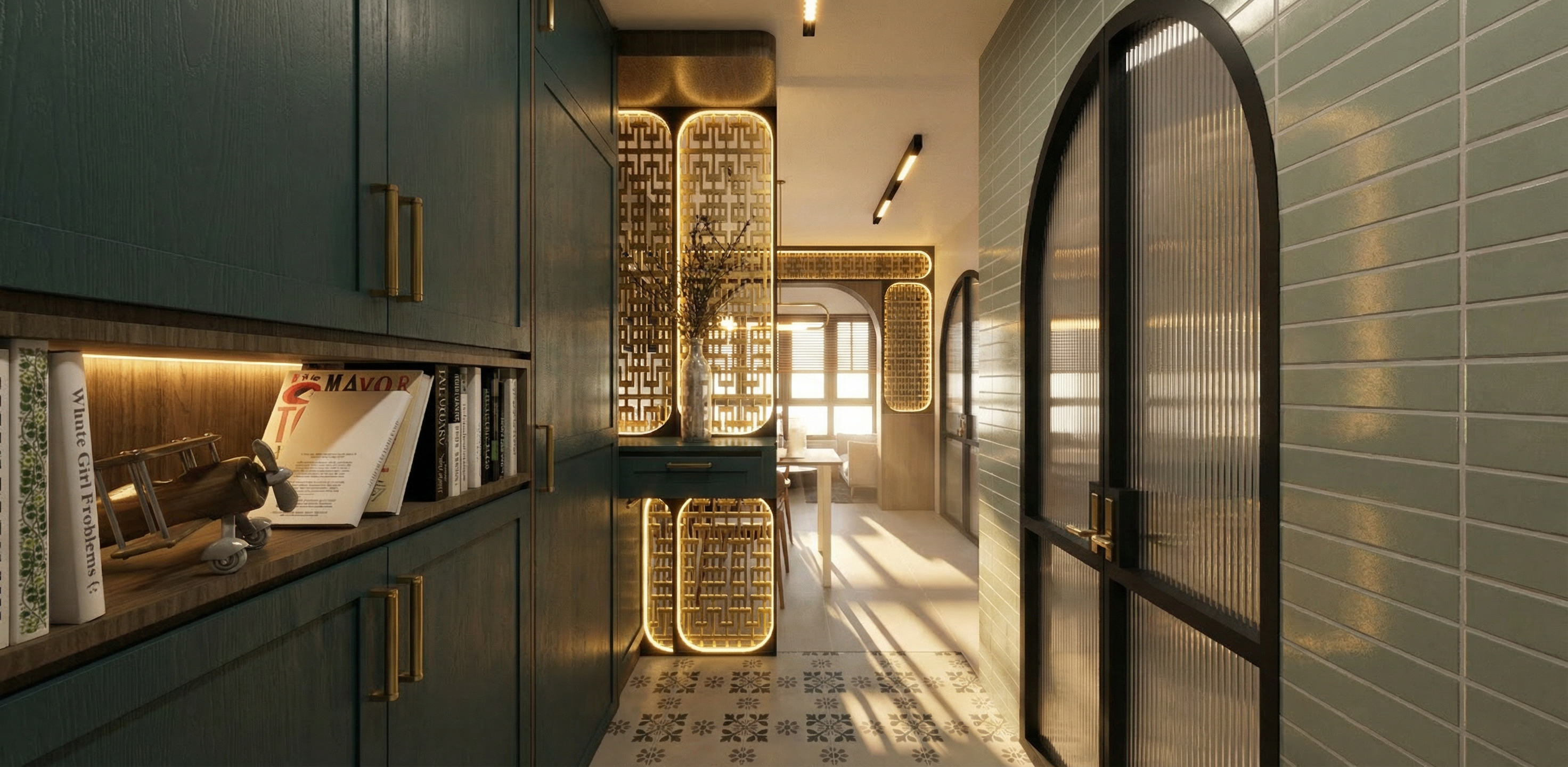 arch doors are black framed with non see through fluted glass add in warm led lighting to niche in the left foreground decorative panels are black framed with curve at 4 corners add in warm led lighting around its perimeter decorative panels are satin gold in color add in warm led lighting to visible track lights on ceiling allow afternoon sun to shine in from the windows in the background wall is finished in light sage green subway tiles on the right foreground add in led lighting to the decorative panels in the background ensure 4 curve corners at the bottom decorative panels the are independent in terms of spacing with the top decorative panels decorative panels in the background are the same as the foreground but those in the background have a sage green backing