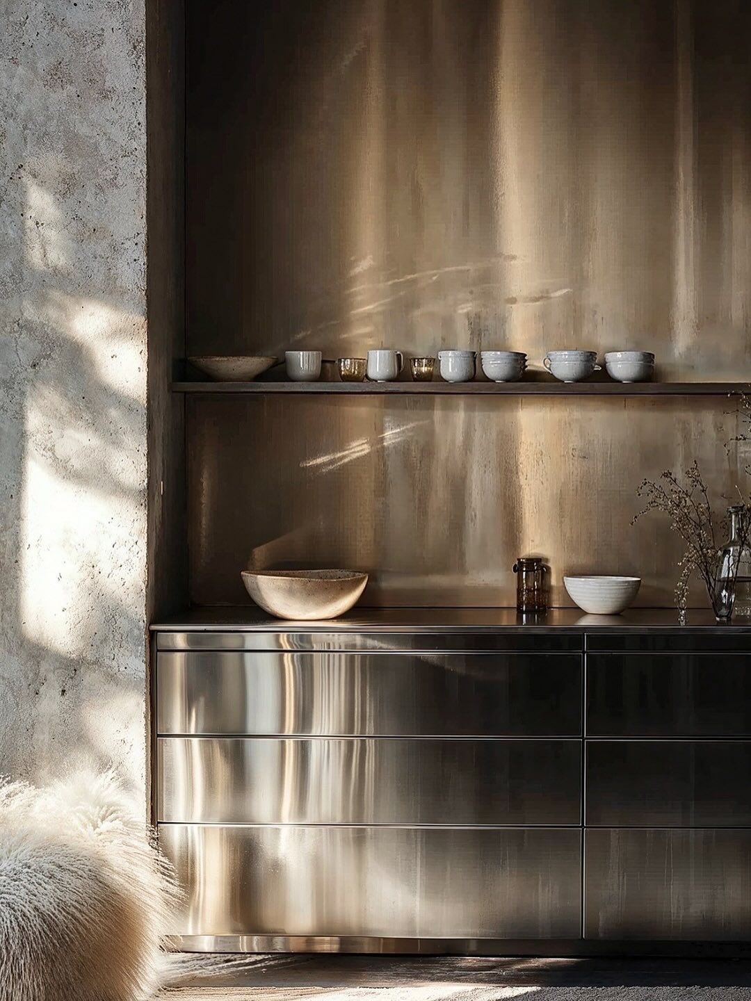exterior shot photorealistic architectural rendering generated from a cad 3d model of a galley kitchen no kitchen island linear parallel layout only refined european apartment proportions warm patinated metal cabinetry in bronze and brushed stainless steel tones soft matte finish with subtle oxidation texture integrated handle less fronts natural stone or lime plaster walls with warm beige undertones historic ceiling cornice detail dark timber flooring soft indirect led under cabinet lighting low contrast cinematic daylight entering from a side window gentle shadow falloff calm atmospheric mood minimal objects ceramic bowls cups metal cookware curated still life styling ultra real materials physically accurate reflections global illumination shallow depth of field high end interior photography look quiet luxury editorial realism no people no island no exaggeration no wide angle distortion