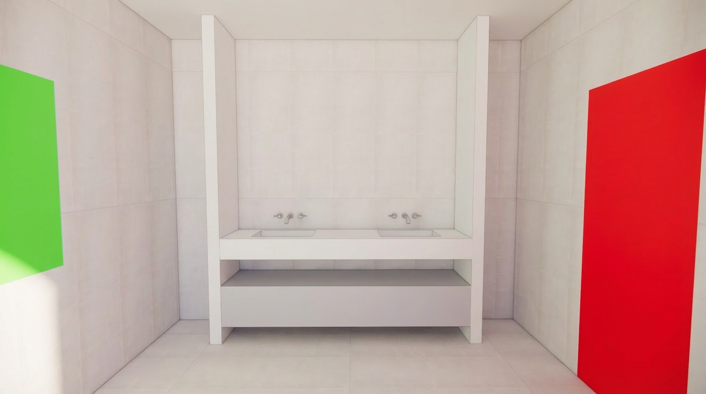 keep everything exactly the same in the rendering do not change the layout walls doors windows shower niche plumbing fixtures wall tile lighting vanity or any materials only change the size and scale of the floor tile the floor tile should be the same exact material and color but the tile size should be changed to large format rectangular tiles approximately 16 x 32 reduce the number of grout lines so the tiles appear larger keep the tile layout straight do not change the tile material color layout direction or anything else only change the green highlighter area to a modern window in white and the red hightlight are is a door make the door a modern flush mount door no panels keep the same size and scale on for both the window and door that is shown do not add anything else keep everything else exactly the same do not add anything else make the final image look like a realistic photo rendering with natural lighting and soft shadows