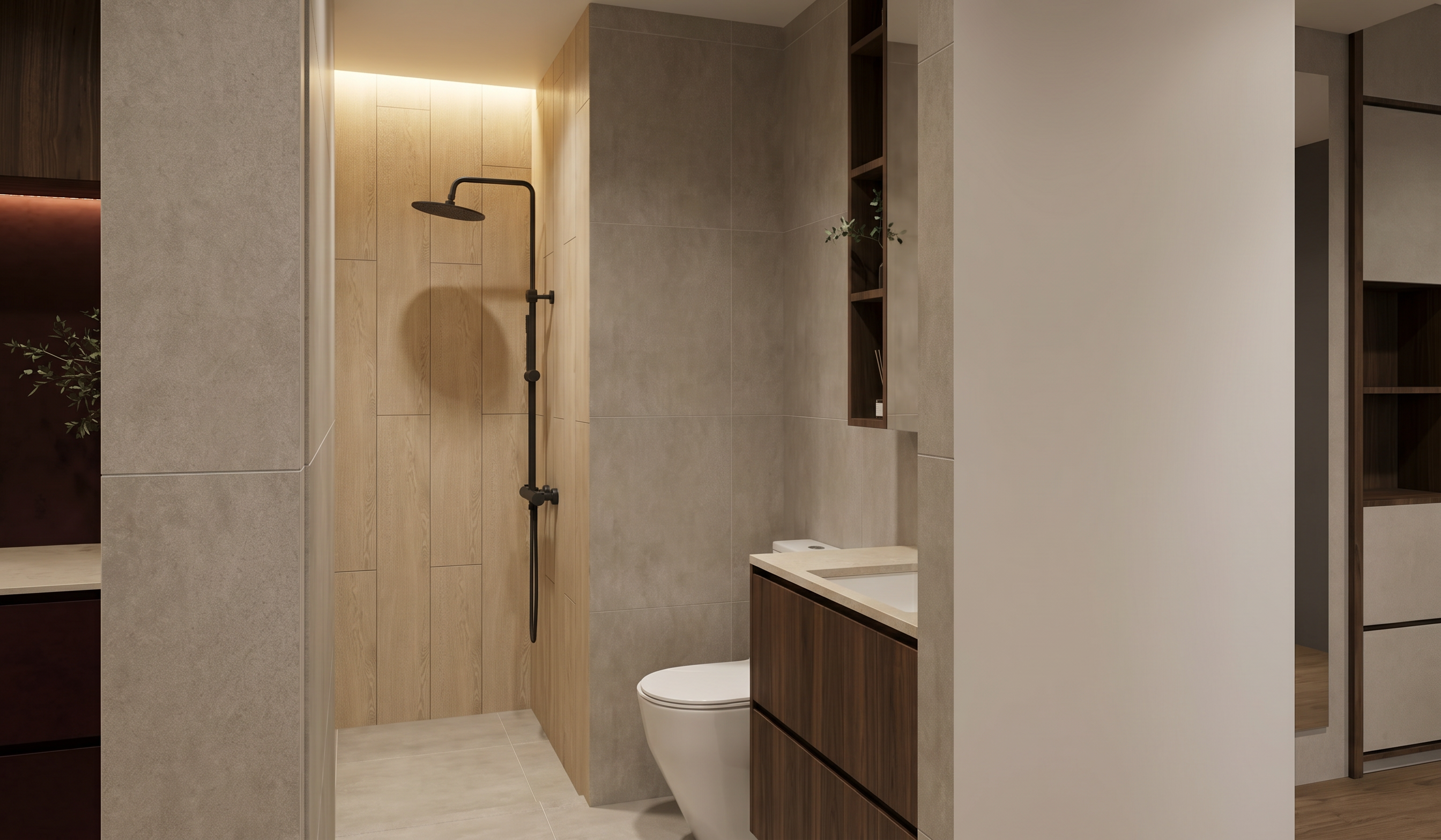 realistic photographic interior rendering in soft natural daylight preserve the architectural layout exactly as shown in the base image painted cabinets warm taupe cream almost white with a whisper of beige undertone soft creamy elevated not stark white not grey not yellow shaker profiles wood cabinets and open shelving warm neutral smoked oak with a taupe undertone medium depth balanced neither cool nor warm visible straight grain matte finish countertops island and backsplash warm creamy beige quartzite in the spirit of taj mahal sand cream base with soft cloudlike taupe and golden grey veining polished sheen continuous across all three surfaces hardware and sconces champagne brushed bronze warm aged refined not yellow brass not chrome hood body painted in the taupe cream trim detailing in the smoked oak
