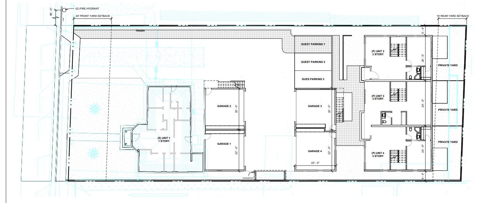 convert this residential subdivision site plan into a realistic aerial isometric 3d architectural visualization the project includes four dwelling units two adus and four detached garages arranged across three buildings connected by a shared driveway show the project from a moderately elevated aerial perspective above the center of the site allowing the viewer to clearly understand building placement driveway circulation garage locations guest parking areas private yard spaces instructions maintain the exact layout and orientation of the site plan keep all structures straight and aligned with the plan geometry do not curve walls or alter the building positions ignore all drawing annotations including dimensions tags notes arrows and labels do not display any text in the final render architecture model the buildings based on the massing style shown in the reference front single story structure rear three story residential units detached garage structures along the driveway use simple contemporary residential architecture typical of los angeles county developments with stucco walls modern windows and neutral materials site elements recreate internal driveway circulation guest parking spaces landscaped setbacks private yard areas behind units sidewalks and pedestrian paths add trees and vegetation typical of southern california residential neighborhoods rendering style high quality architectural visualization with realistic lighting clean landscaping and clear site organization vehicles may be added for scale do not add people