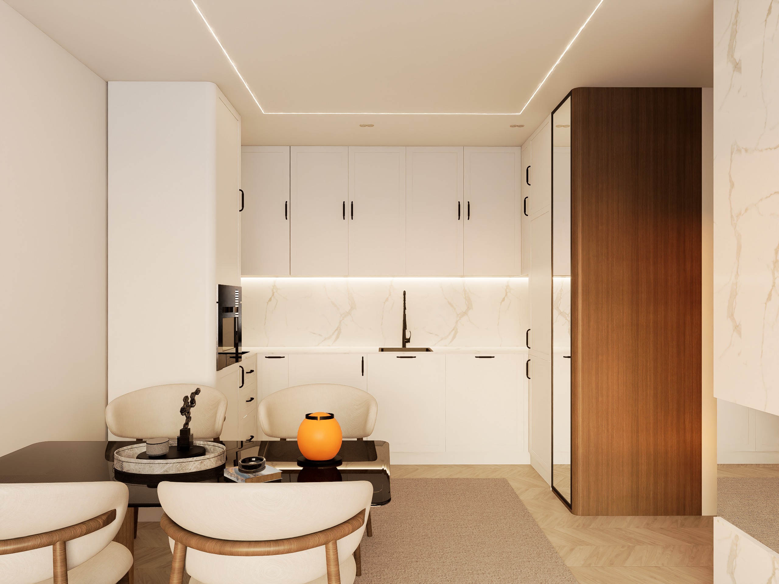 ultra realistic architectural render of a modern kitchen dining corner preserve the exact layout proportions furniture placement and camera angle from the reference image color palette soft warm beige cabinetry combined with dark warm walnut wood vertical grain rich natural tone matte satin finish kitchen cabinetry upper and lower cabinets in matte beige clean shaker style fronts with slim black handles perfect alignment minimal gaps high end finish backsplash wall light marble surface with subtle beige veining continuous and seamless integrated under cabinet led strip soft warm white diffused glow countertop light neutral tone smooth minimal reflectivity appliances fixtures keep exact positions sink centered built in coffee machine on left black matte faucet and details right side volume full height walnut wood panel with vertical grain orientation important integrated mirror panel reflecting space clean and flush dining area foreground maintain table and chairs exactly soft beige upholstered chairs with wood legs dark table surface with subtle reflections accessories styling premium minimal decorative tray with small objects one warm glowing lamp soft amber tone keep everything clean curated not cluttered lighting ceiling recessed perimeter led continuous warm tone under cabinet lighting for depth soft global illumination no harsh shadows balanced warm interior mood materials physically accurate high end textures no plastic look no over gloss subtle imperfections for realism rendering style ultra photorealistic interior editorial quality soft shadows high dynamic range premium atmosphere do not change layout proportions or materials only enhance realism lighting and material depth
