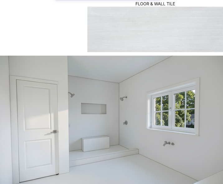 keep everything exactly the same in the rendering do not change the layout only add the exact tile shown on all the walls and floor show them as 16x48 rectangular tiles and make sure the grain of the tile is suddle and more white also add a shower glass to the shower and a rain head in the middle ceiling of the shower