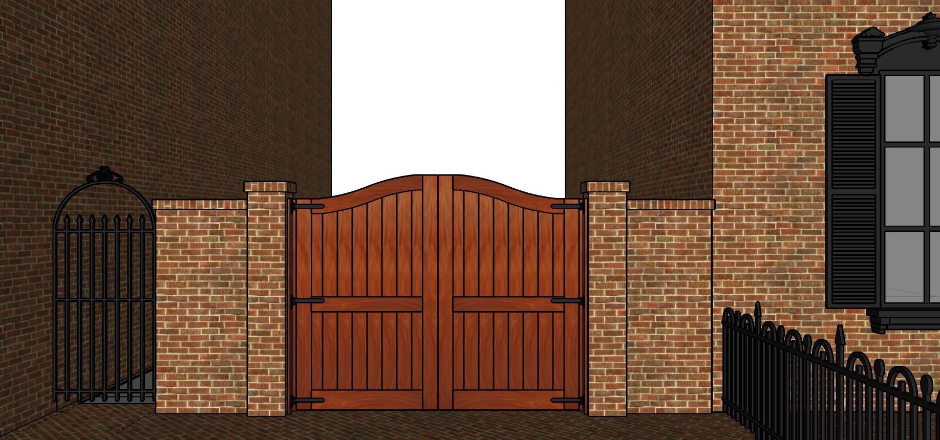 render an elegant brick wall pathway with iron gates the walls are made of classic red brown bricks with subtle earthy tones creating a warm and inviting atmosphere the arched gates are crafted from rich mahogany stained wood with a smooth polished finish the ironwork is a deep matte black adding a sense of sophistication and contrast the setting should evoke a serene and timeless elegance with soft natural lighting to enhance the textures and colors creating a peaceful inviting aura