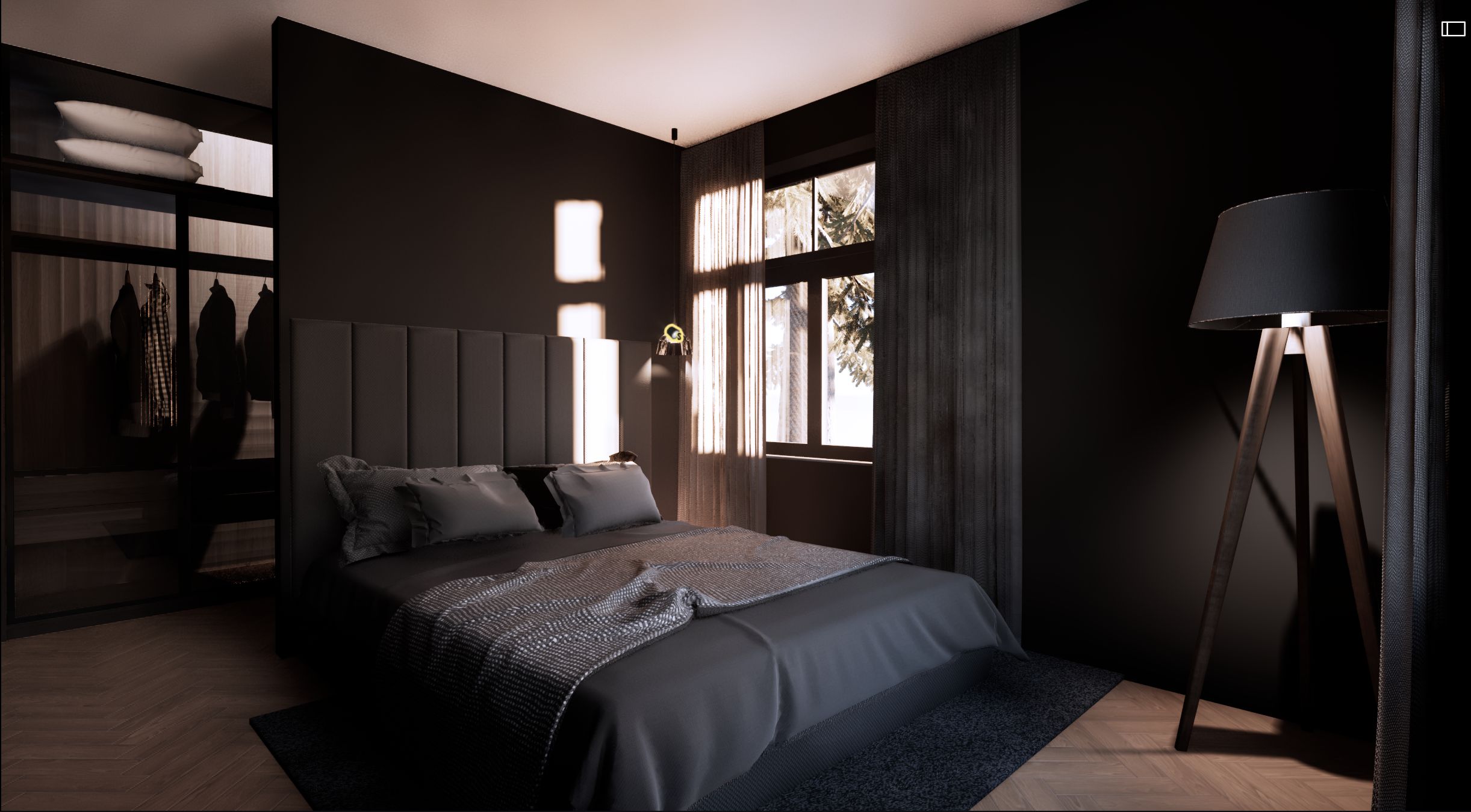 bedroom in dark tones in the back area there are wardrobe cabinets modern minimalist style add curtains a rug a headboard darker colored walls baseboards and lighting fixtures add spotlights in the wardrobe area above the bed in the bedroom place a minimalist black light fixture make the scene more photorealistic and use dark grey curtains