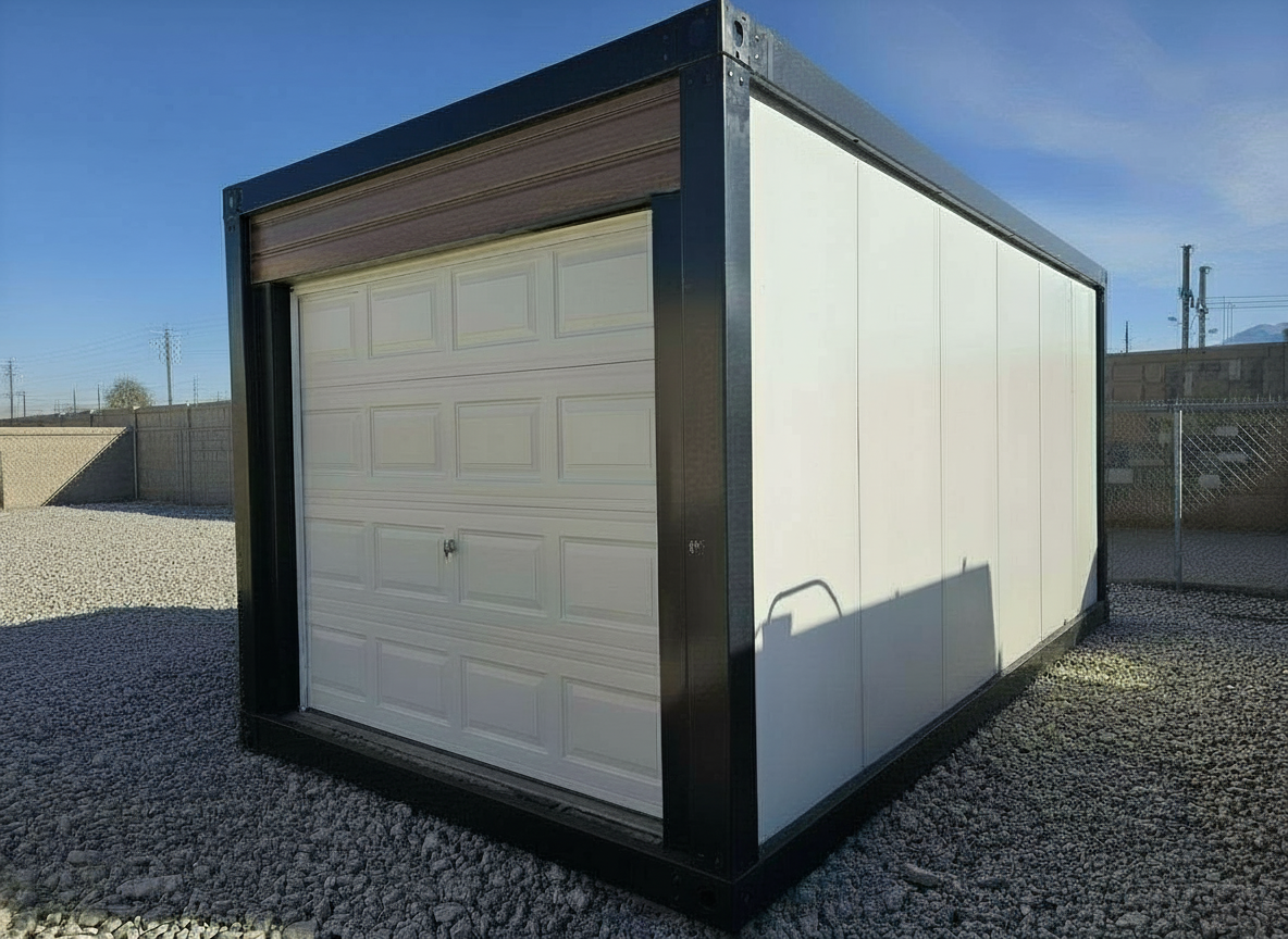 change the extirior and background to make this look like a modern storage space in a landscaped area