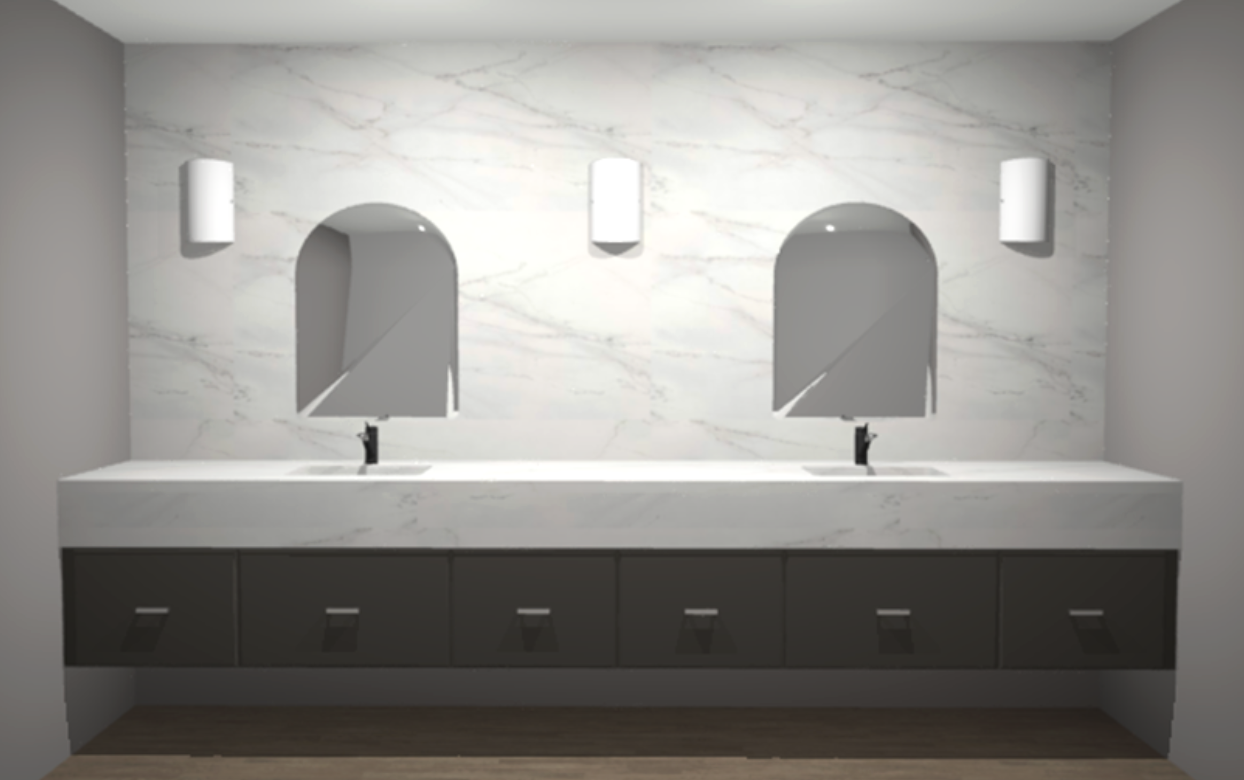 change mirrors to rectagular vertical change sconces to linear vertical add accessories such as a plant and a facecloth to the counter remove handles from drawers make all 6 drawers across the front of the vanity the same size each