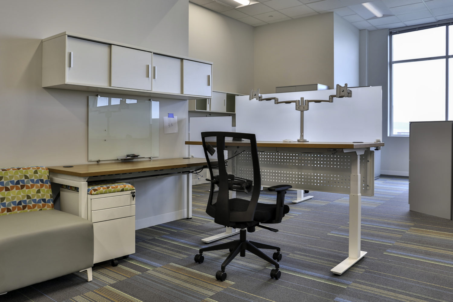 add decor on desk add monitors to the monitor arms keep all furniture the same add someone walking in background