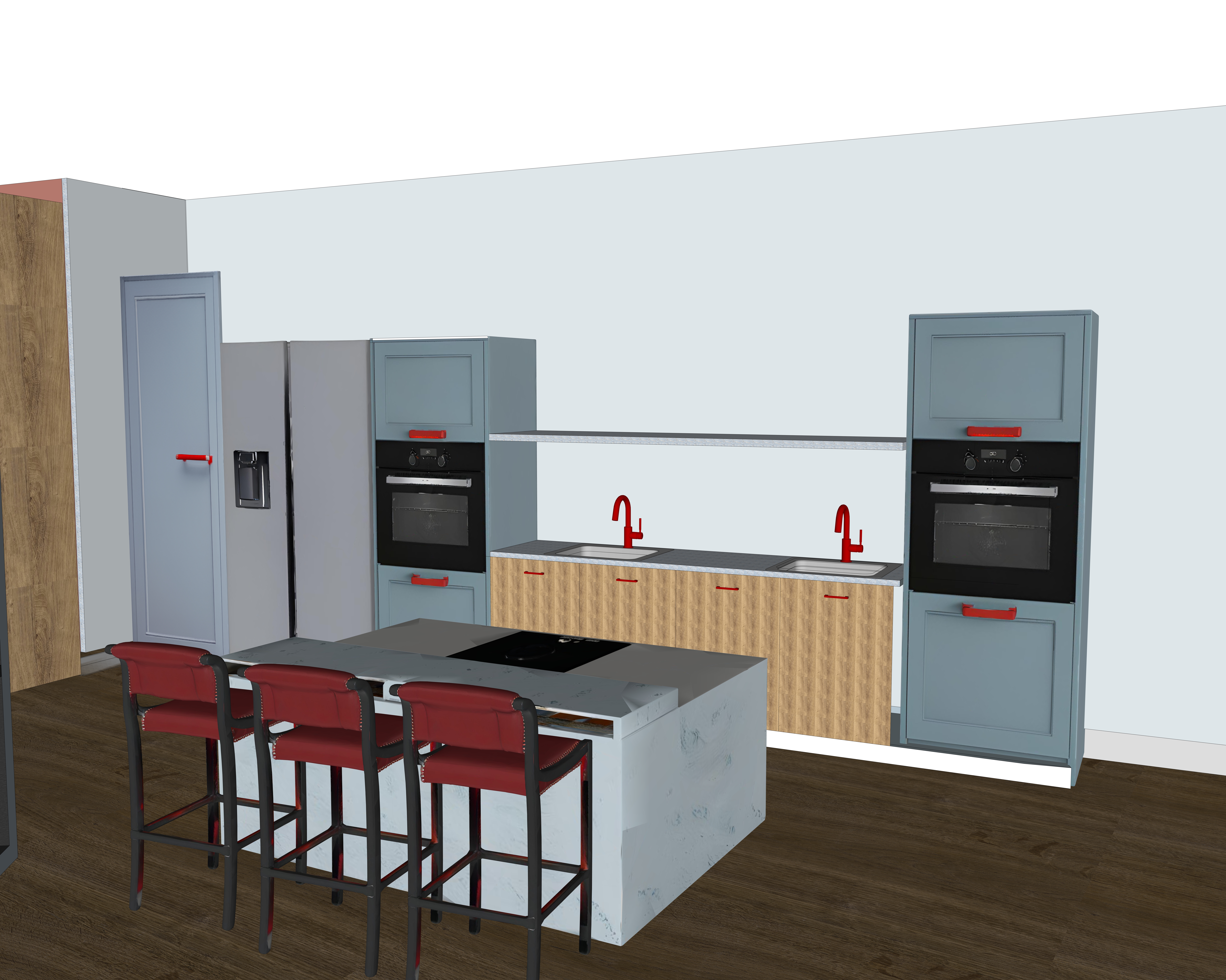 make the image look more realistic add ceiling stoplights in red between the island and the sink area add blue cupboards