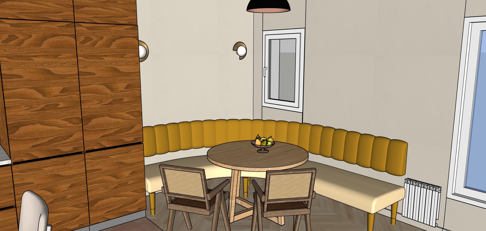 photo realistic kitchen table respect proportion and colors natural daylight from the window and soft and warm light from the lamps on the wall and the seilling the wiew from the windows are paris buildings