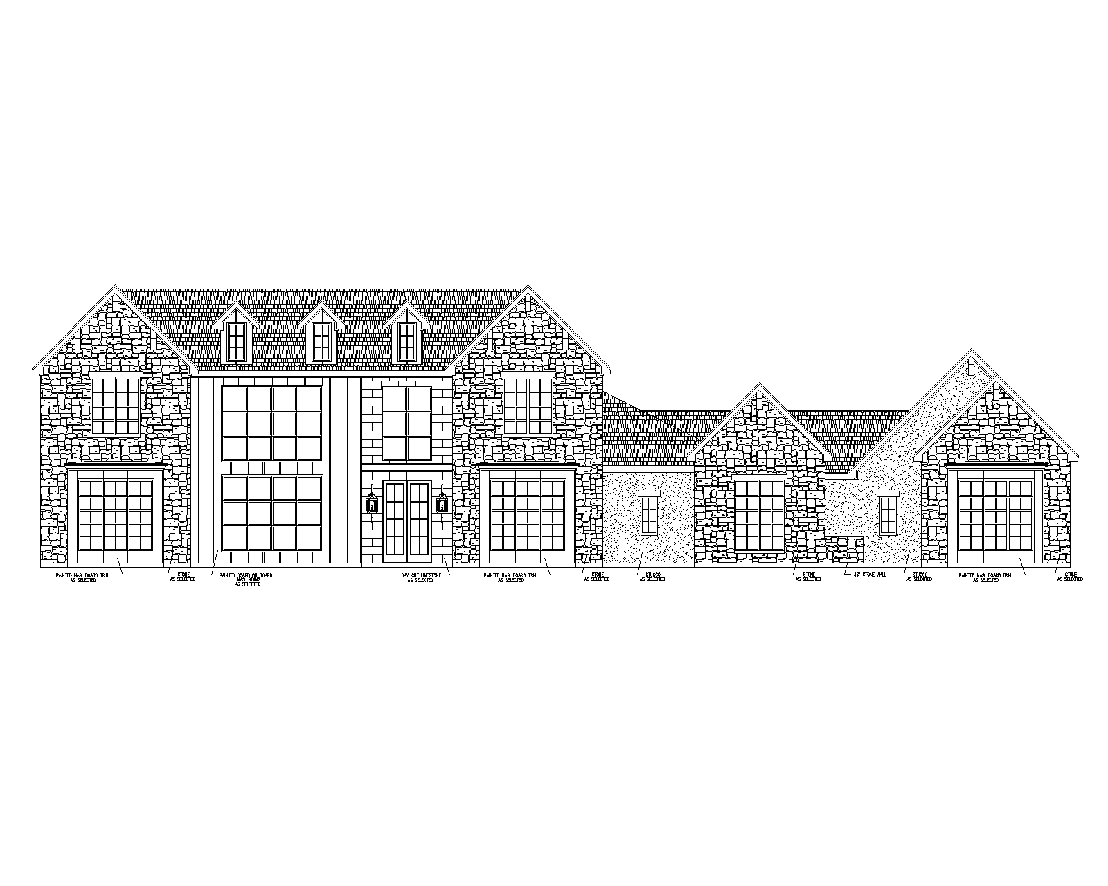 create a photorealistic luxury modern european english cottage style exterior using the uploaded design as fixed geometry reference change materials and colors only and preserve the original architecture exactly apply creamy off white hand cut limestone veneer with subtle variation in rectangular ashlar stone blocks and soft neutral mortar a steep pitch charcoal black roof with a refined architectural shingle or slate look appearance thin profile black metal framed windows dark bronze to black gutters and downspouts dark charcoal painted accent projections and warm natural white oak front entry doors keep the palette restrained elegant and high contrast with realistic daylight crisp shadows and high end custom home material realism add simple formal landscaping with low clipped green shrubs and clean lawn edges do not change window sizes or placement do not add shutters do not add chimneys do not alter roof lines do not change massing do not move doors do not change trim details and do not introduce extra materials or decorative elements use full image do not cut off any part of the original drawing make front door metal and glass see text for material call outs add sky clouds and trees