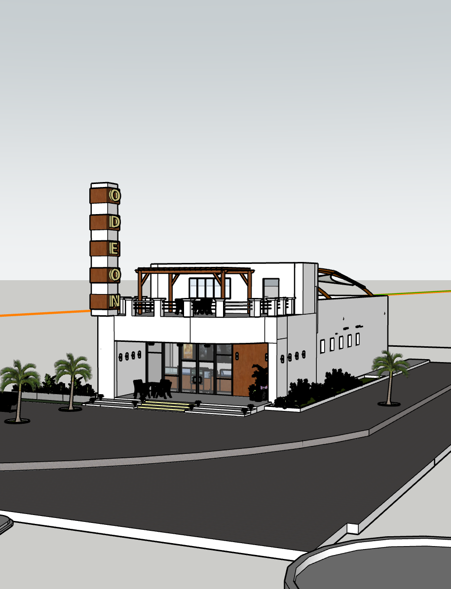 using the uploaded reference image of the odeon cinema in downtown djibouti redesign the building while keeping the original essence of its structure and entrance intact the facade should be refreshed with polished materials and clean white stucco reflecting a modern mediterranean feel the iconic vertical odeon sign is a bold led feature glowing clearly in daylight set the scene in early afternoon with bright natural light and soft shadows the surrounding street is lively and animated reflecting the everyday rhythm of downtown djibouti add wide sidewalks with simple wood and metal benches small groups of people sitting chatting and waiting pedestrians street vendors and light local traffic add movement and authenticity palm trees and low greenery line the sidewalks forming a subtle urban garden atmosphere without overwhelming the architecture the entrance remains true to the original layout with small planters and benches framing the plaza in front rooftop access is visible hinting at people enjoying the upper level streetlights subtle ambient lighting and signage along the neighboring buildings add urban vibrancy the overall tone is nostalgic yet modern a cultural hub in the heart of djibouti alive with people and activity