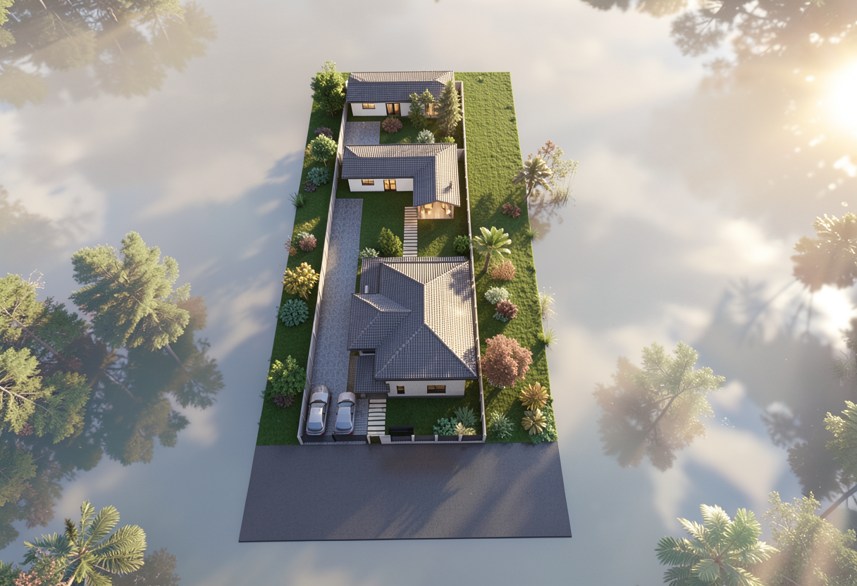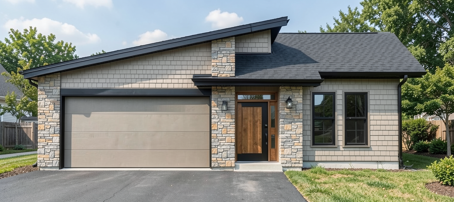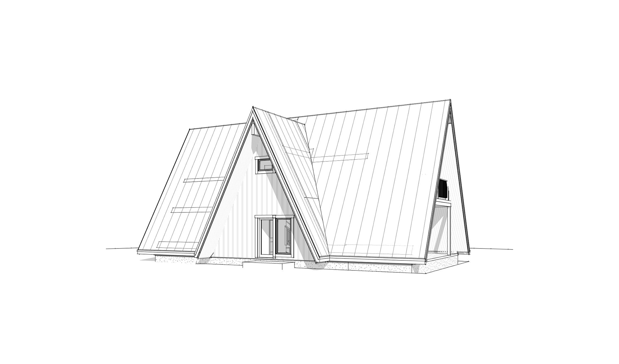 front view of a clean rustic a frame cabin architectural exterior home rendered in cinematic vibrant day time lighting with big clouds in the sky cabin in the forrest with streaks of light coming through the trees warm glow and reflections off of the windows rustic select grade vertical warm wood cedar siding green manicured landscape around structure with gardens and patches of grass black standing seam metal roof prominent cinematic forest with big douglas fir trees and ferns and moss surrounding behind the house in the background high fidelity photorealistic visualization crisp shadow falloff refined facade geometry soft atmospheric depth premium architectural photography mood ultra clean composition and materials dark trim around windows flat roof photorealistic render concrete path leading to the front door