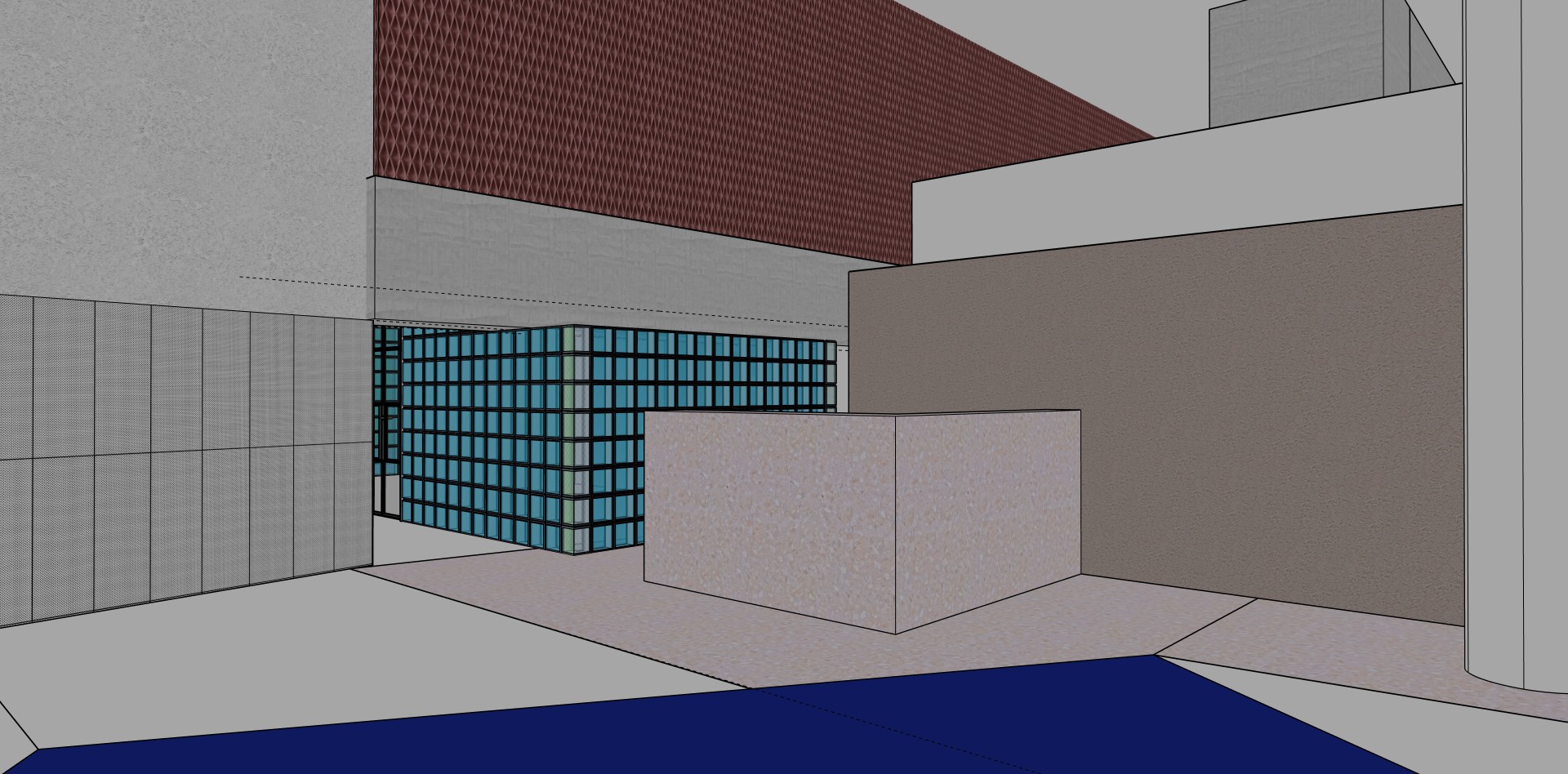 maintain exact geometry camera position composition and object placement do not change replace recolor or reinterpret existing materials unless explicitly stated the reception desk must remain terracotta terrazzo exactly as modeled do not change it to stone or concrete only enhance realism lighting and surface detail style atmosphere ultra realistic architectural render of a high end industrial performance gym interior clean minimal strong graphic presence editorial architectural photography style sharp but natural realism no softness or residential warmth lighting cool neutral overall color temperature 4300 4800k strong directional linear led lighting feel like exposed strip lights subtle contrast between cool ambient and slightly warmer highlights glass blocks softly internally illuminated with diffused glow controlled reflections no overexposure crisp shadow definition slight cinematic contrast not dramatic materials refinement only do not change placement glass block wall semi translucent ribbed or grid glass texture internal light diffusion subtle blue tint removed keep more neutral architectural tone introduce a gentle warm spa glow from within the glass blocks 2800 3000k soft and diffused subtle and atmospheric without increasing brightness or altering the glass material itself large stone block dark terracotta terrazzo sitting on terrazzo flooring with the same finish white volumes textured plaster dark terracotta wall acoustic paneling non reflective with dimension to it mid grey cast concrete natural cement tone visible subtle cement variation soft clouding slight tonal movement matte finish industrial character maintain clear distinction between concrete and white plaster volumes navy blue is dark navy gym matt rubber surface quality high material fidelity micro surface imperfections subtle roughness variation realistic ior values no glossy plastic look mood reference interpretation blend rebel style athletic intensity clean industrial mesh ceiling aesthetic concrete minimalism graphic gym branding presence but do not add new graphics unless present in model camera rendering architectural photography lens approx 24 28mm full frame equivalent vertical lines perfectly straight high dynamic range balanced exposure no bloom effects no depth of field blur ultra sharp detail 8k quality ray traced global illumination realistic reflections and bounce light environment tone premium performance training facility confident bold graphic modern european athletic design language minimal but powerful