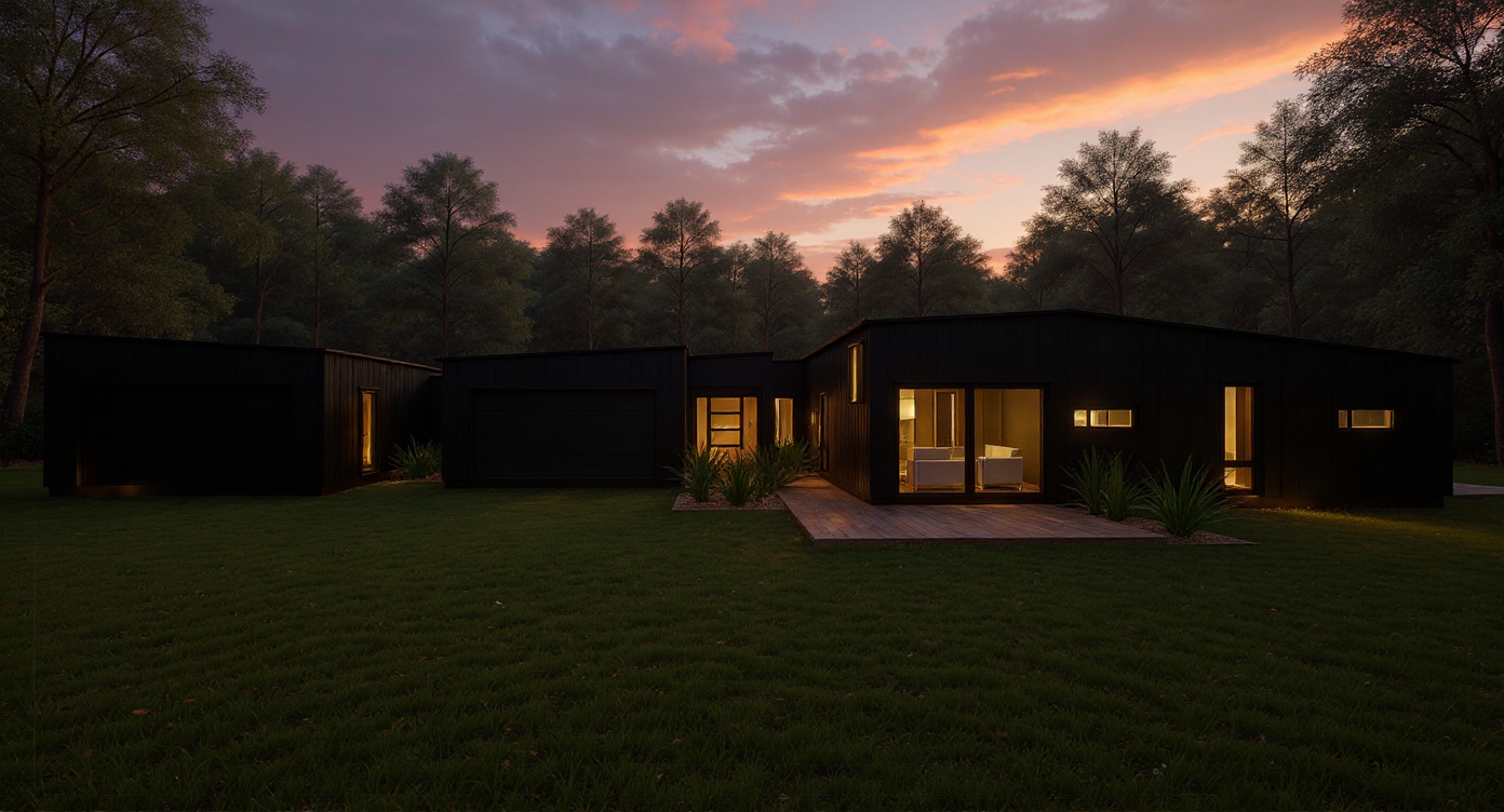 keep selected image perspective black board and batten cladding black roof black window frames low timber deck manicured lawn extensive native plantings trees in background sunset interior lights on concrete by garage