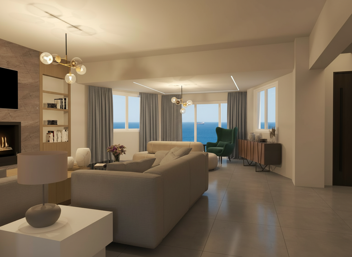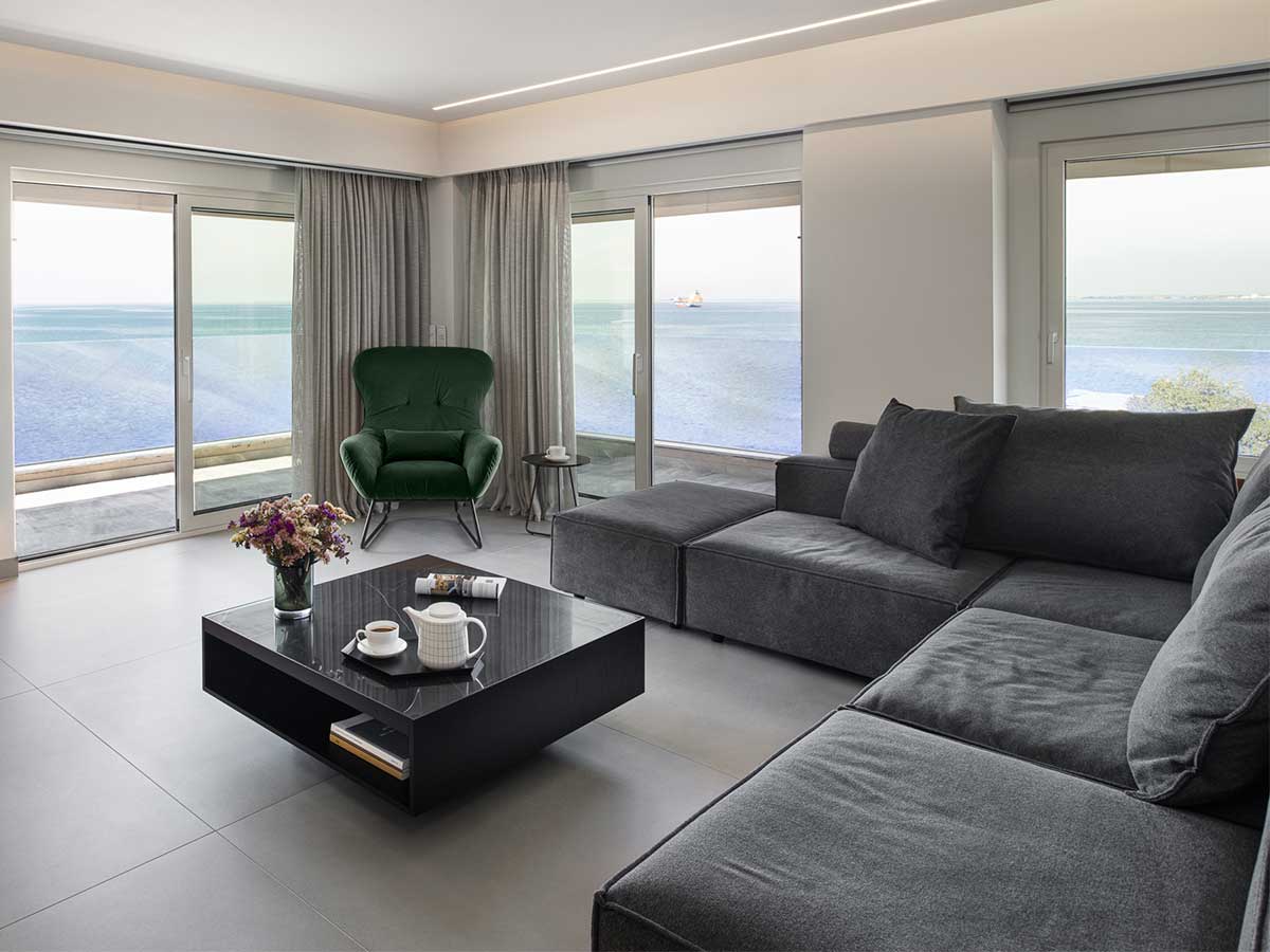 exterior shot modern minimalist living room interior the atmosphere is calm and inviting with abundant natural light filtering through the windows casting gentle shadows