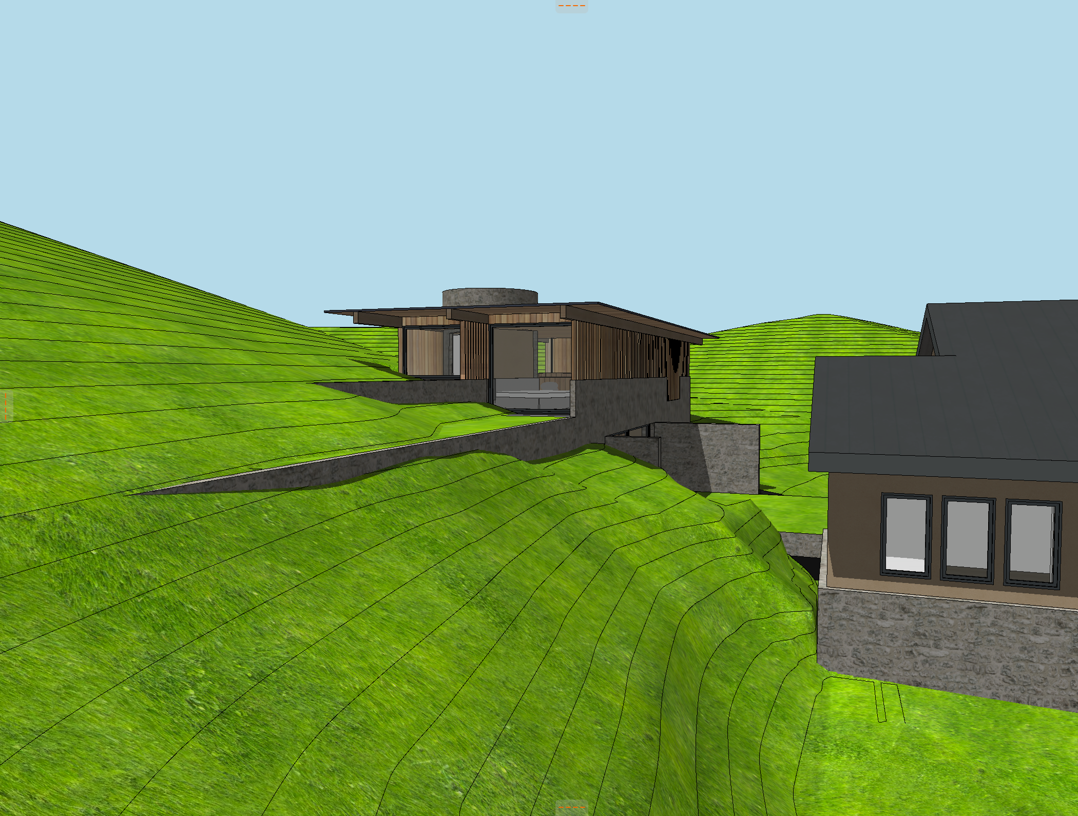wood louvers on the entire length of wall with windows behind and soft interior light spilling through landscape hillside with sagebrush and tall wild grasses brown drystack stone walls corten standing seam metal roof