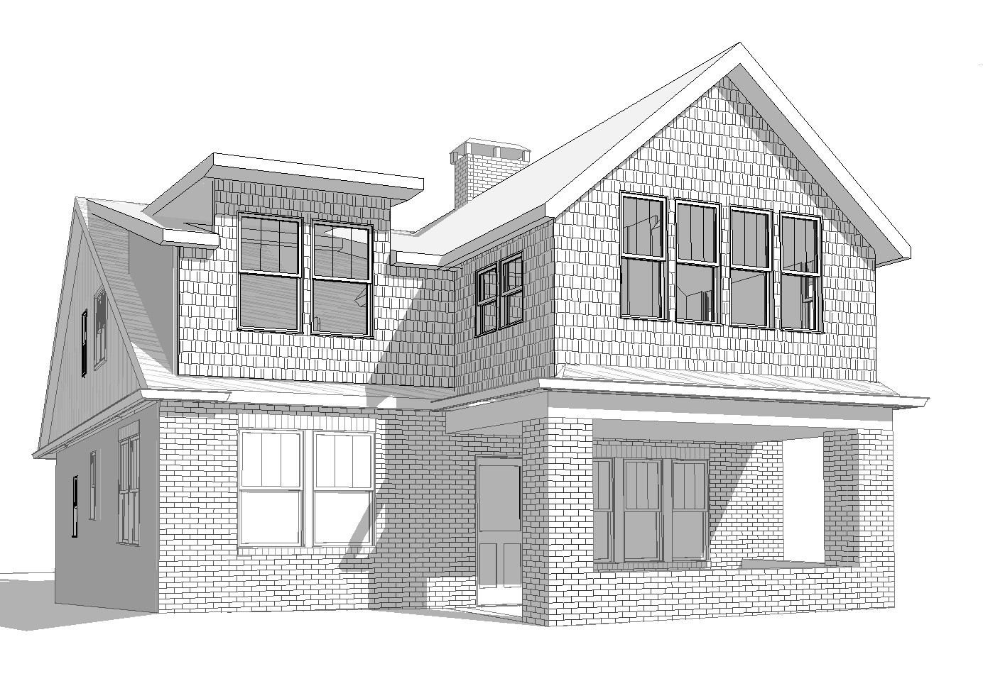 exterior shot i have attached a black and white line drawing of a house please render the exact drawing in a realisitic style the image should be soft it should be a sunny day with trees behind the house there should be landscaping that us lush and well composed around the front of the house and green grass in the yard for the style of the architecture please reference the additional example image this image can be referenced for paint colors and trim styles and exterior material that should be in the rendering of my line drawing