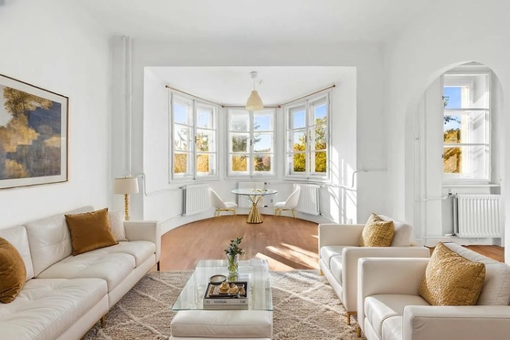 odstra trubky topen a vykresli nov radi tory s vy st n m do zdi nad okny a pouze nad nimi vykresli nerezov trubky s hladkou pr svitnou spl vavou z clonou a t sn nad podlahou ve v klenku vykresli kr sn k i lov lustr sole ek se idlemi vykresli d le od oken idel vykresli se d ev n mi nohami vylep i sv tlo p idej romantickou atmosf ru a jemn slune n sv tlo c lem je pr miov prezentace real estate