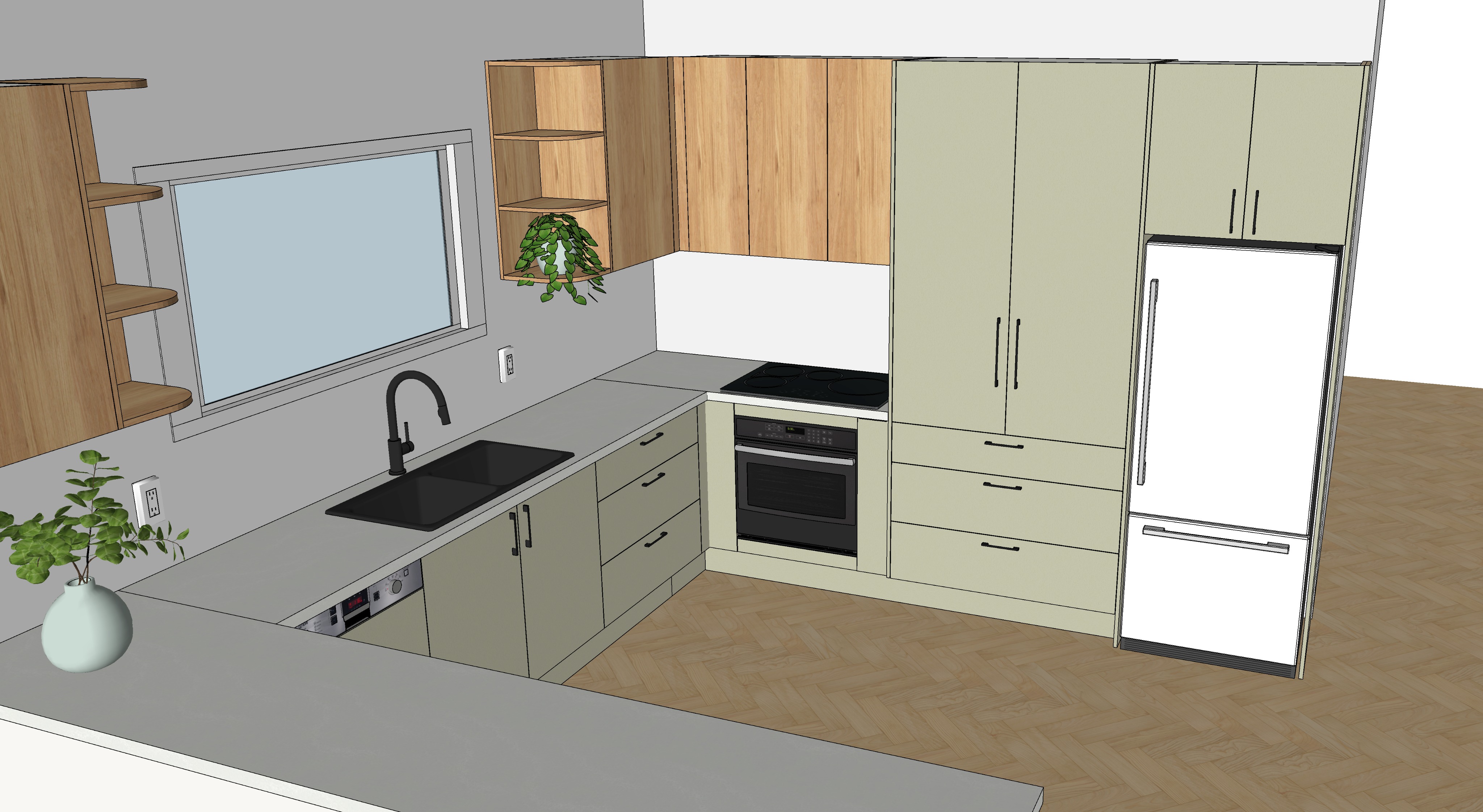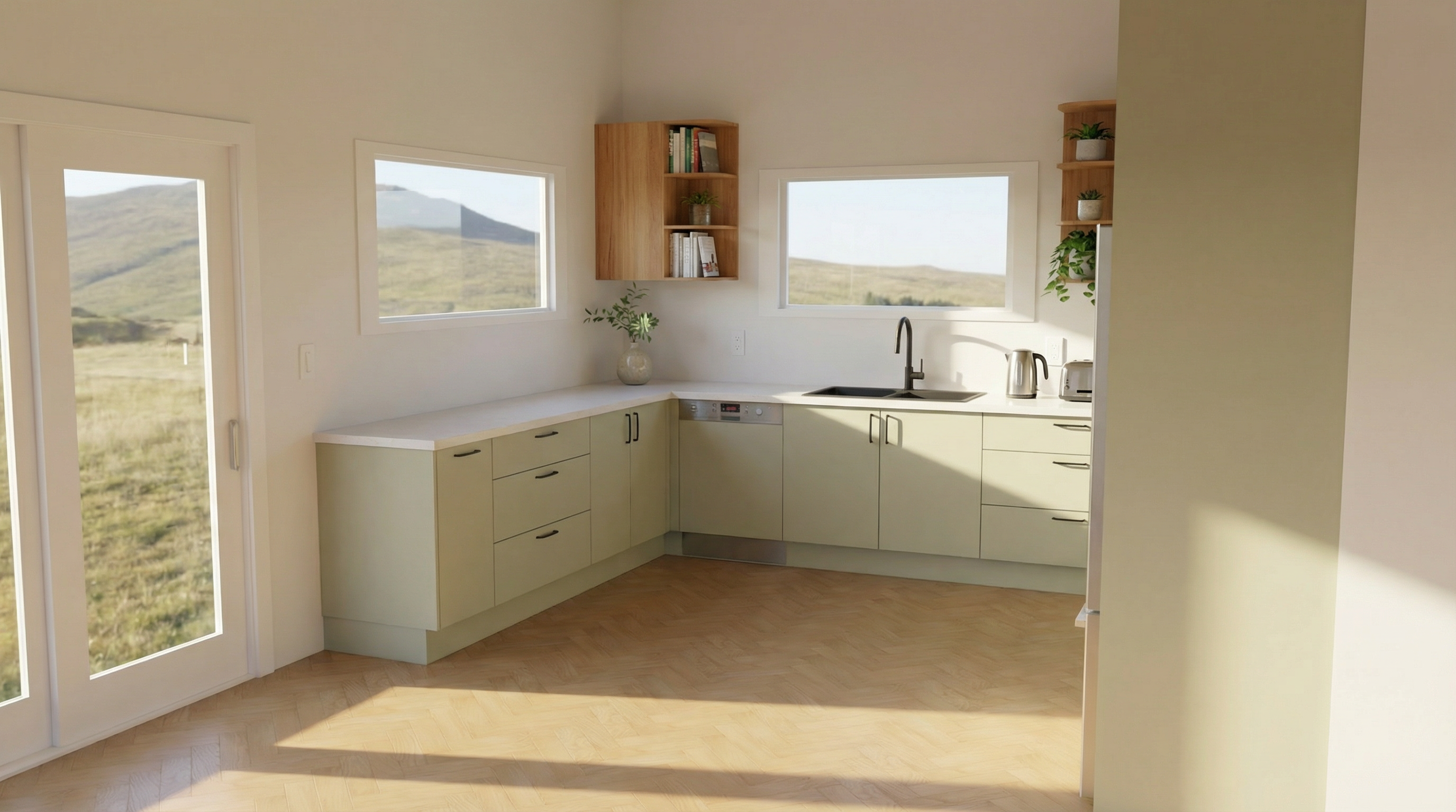please render this and a minimal amount beautiful plants and books to shelves and minimal kitchen appliances just enough to add a touch of class add a grass mountain in the distance out the windows the cabinet door and drawer fonts are laminex gumnut and the overheads and shelves are blackbutt make the room slightly warm dont alter any of the cabinetry the benchtop is white stone