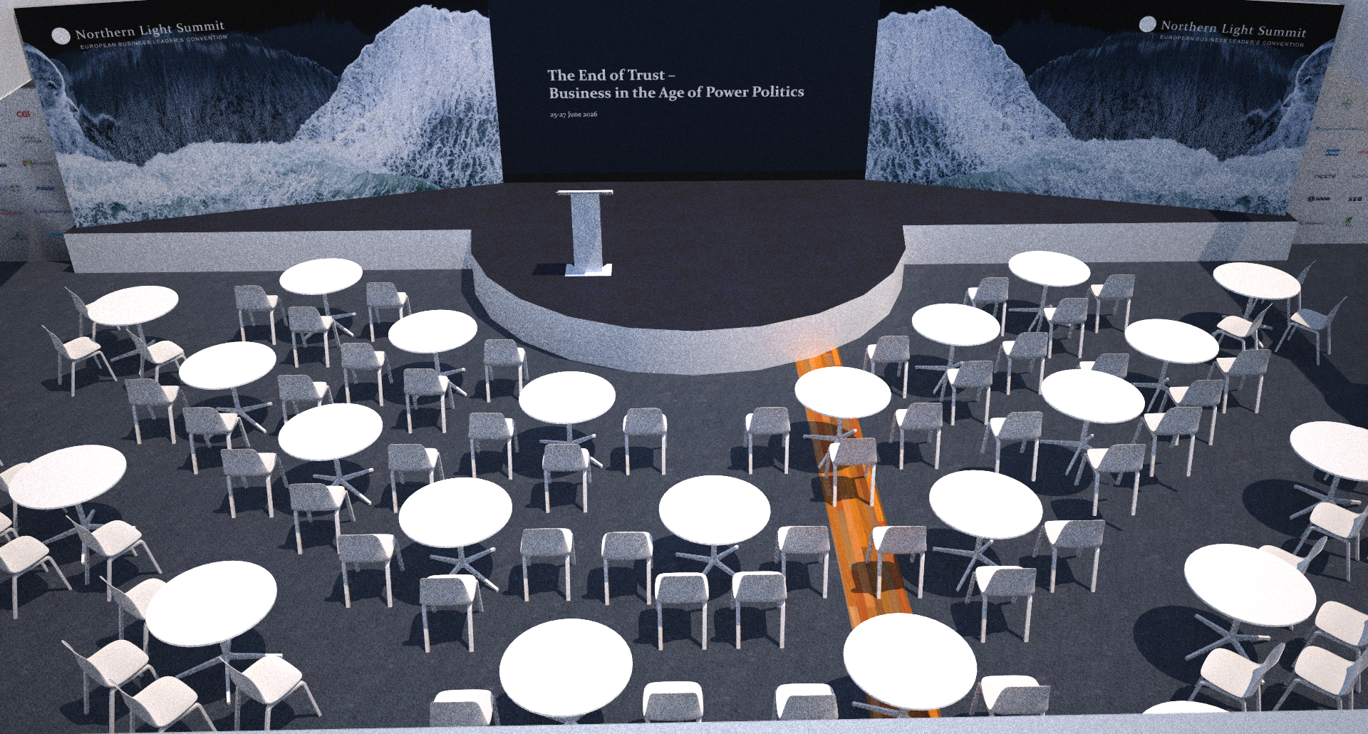 while maintaining the back wall image logos and text intact the lectern should be mirror covered the floor and stage surface should be very dark exhibition carpet