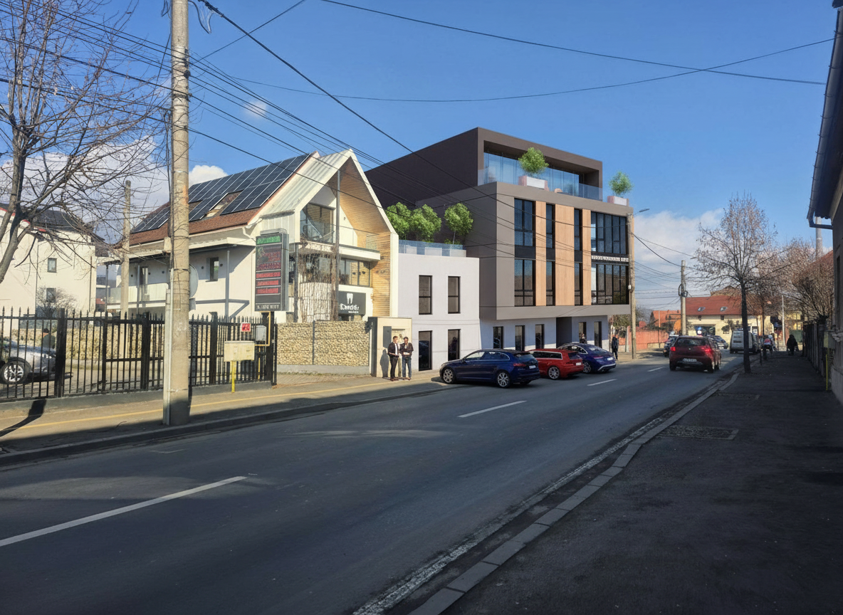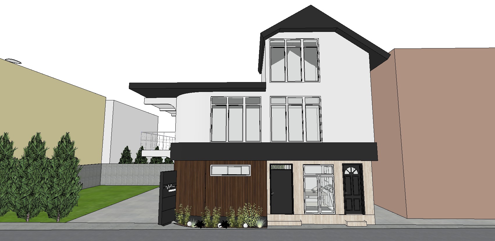 this is a cardiology office and you need to make a high quality render the ambient light should not be warm but more illuminated with natural light and 4000k light its exterior should look as real and high quality as possible the ground floor is used as a cardiology office while the upper floors are used as a residential building so the facade should distinguish the ground floor from the attic even the window panes on the ground floor should be blurred because the interior should not be visible while on the upper floors place white curtains in the interior the greenery should be real in front of the object and the white spheres are small lights while on the ground of the metal cap with aluminum a logo is placed and it is with white led light which should be clearly visible even from afar do not change anything in the design or anything else just make the render high quality and real activate two point perspective the window frames are white