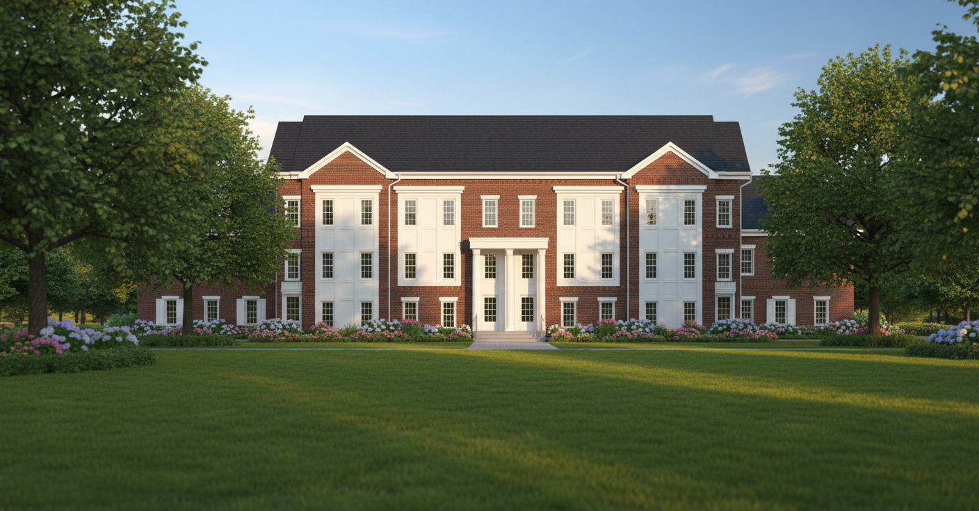make a hyper realistic 3d picture of this home in a park like setting with the landscaping and the sun shining shingles are black brick is red siding and trim is white don t add any extra walls don t have any trees block the building